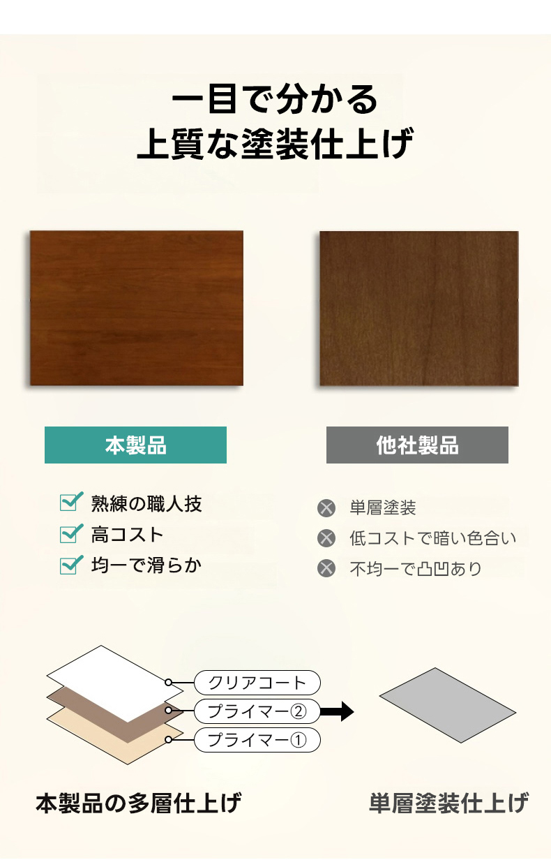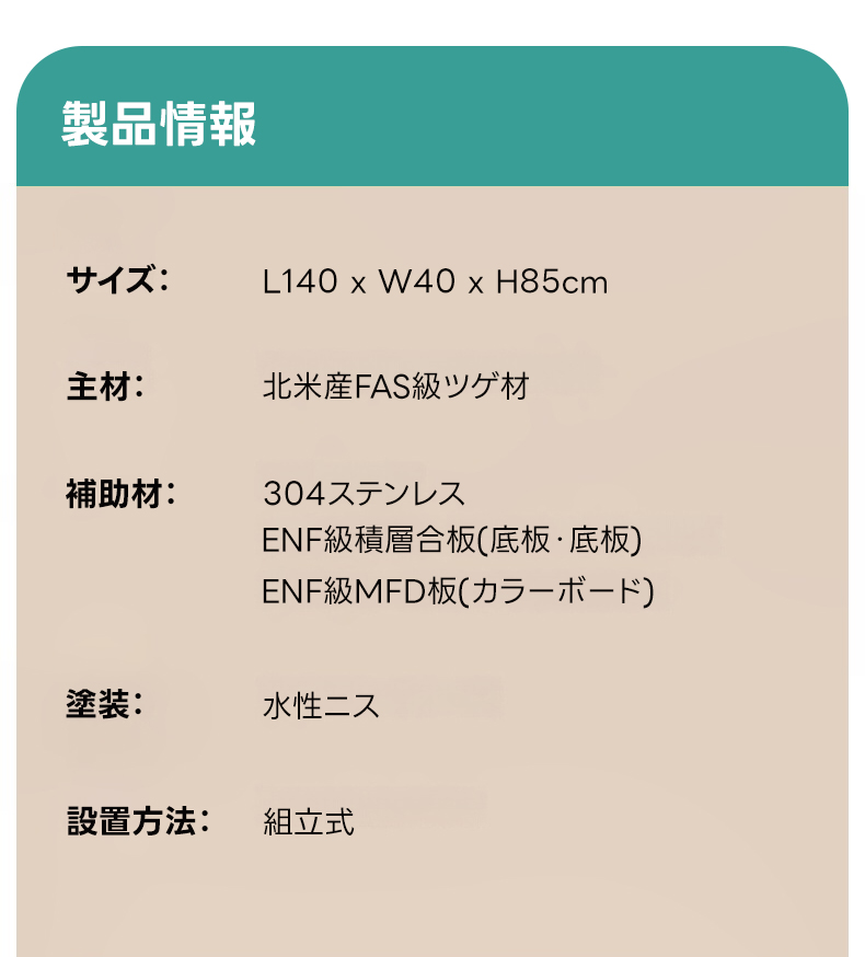 - 【高品質な素材と仕上げ】北米産のFAS級ツゲ材を主材に使用し、補助材には304ステンレスとENF級積層合板を採用。環境に配慮した水性ニス仕上げで、耐久性と美しさを兼ね備えています。