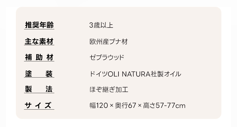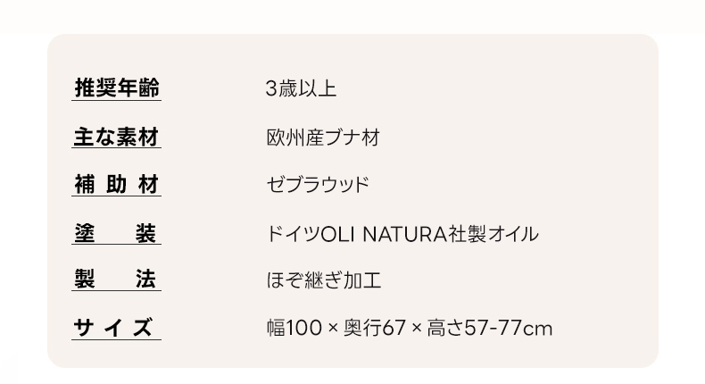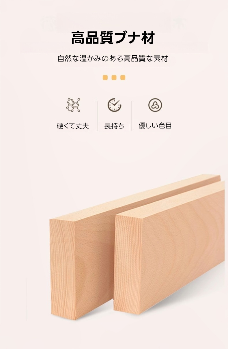 - 【高品質な素材とデザイン】ヨーロッパ産の高品質なブナ材とゼブラウッド材を使用し、自然な温かみと耐久性を兼ね備えたデザインです。角丸加工が施されており、安全性も考慮されています。天然植物オイルを使用した安全な塗料を採用しています。