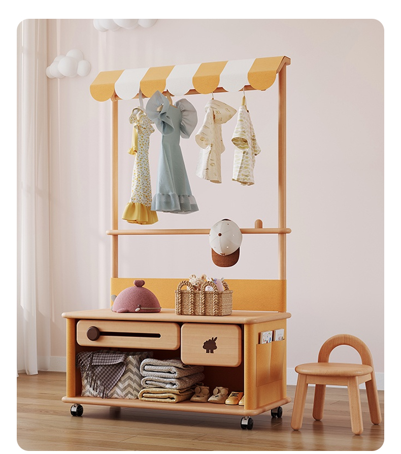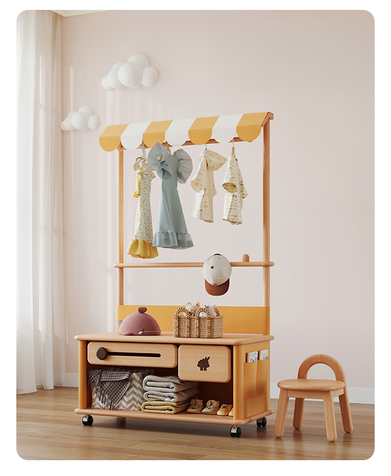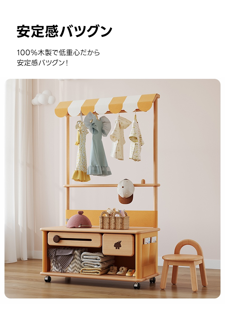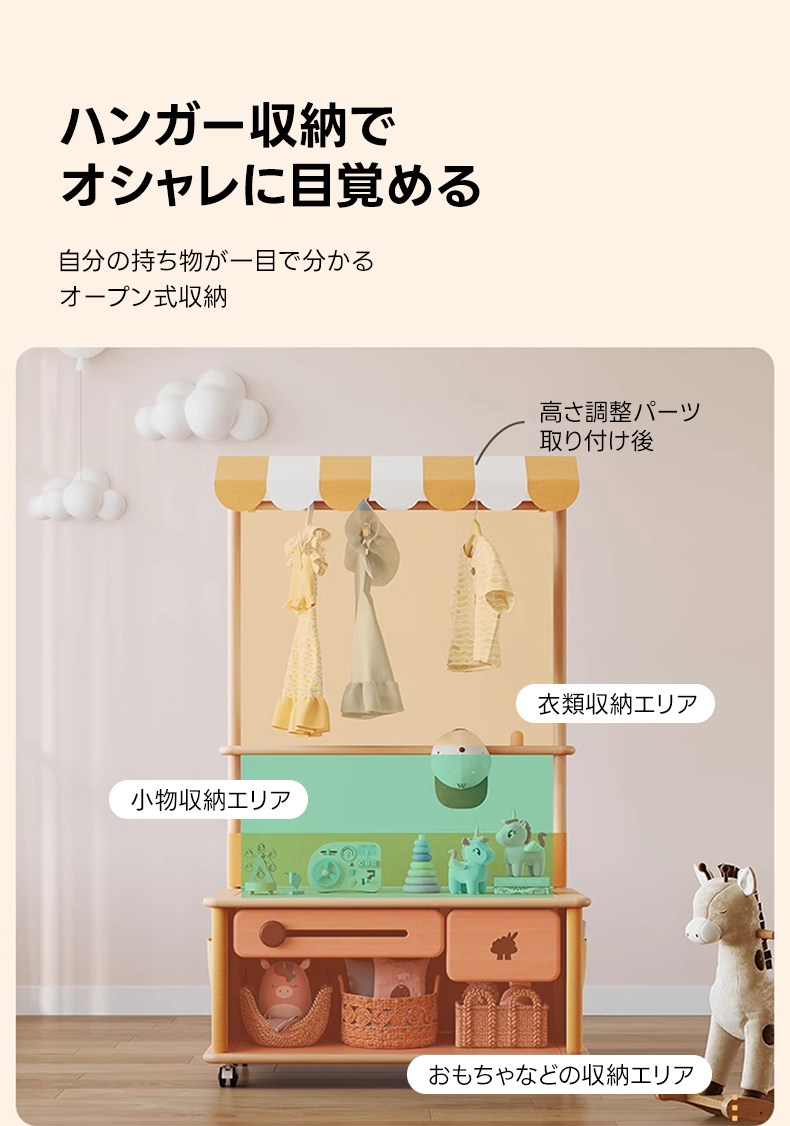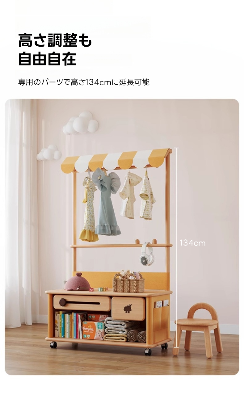 - 【多機能収納で整理整頓が楽々】この子ども用メルヘン収納ラックは、ハンガー収納、小物収納、引き出し収納、オープン収納が組み合わさっており、衣類やおもちゃ、本などを整理整頓できます。成長に合わせて高さを102cmから134cmまで調整可能で、長くお使いいただけます。