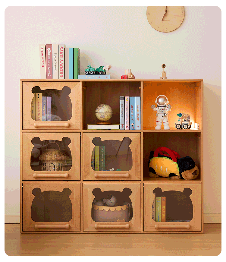 - 【ユニークなデザインと多機能収納】パンダキャビネットは、子どもたちの興味を引く可愛らしいデザインが特徴です。パンダの形をした扉は取り外し可能で、オープン収納としても利用できます。89x87x40cmから132x124x40cmまでのサイズ展開で、成長に合わせてカスタマイズ可能です。