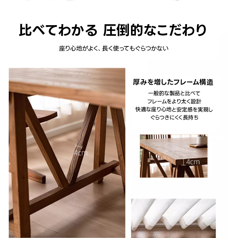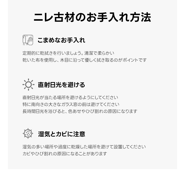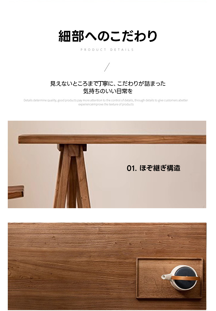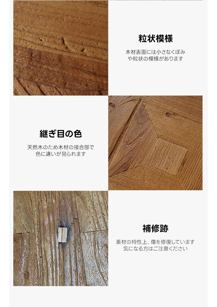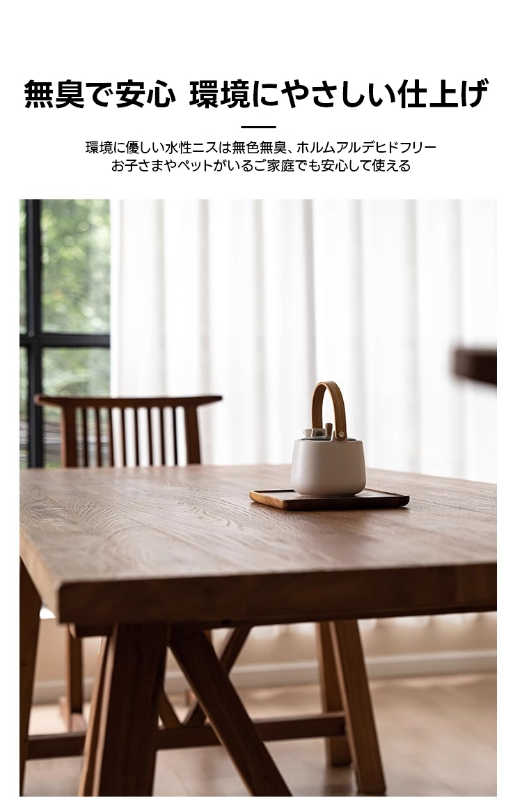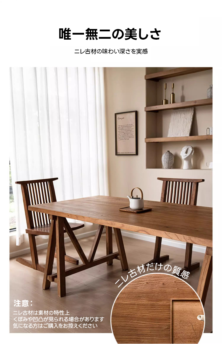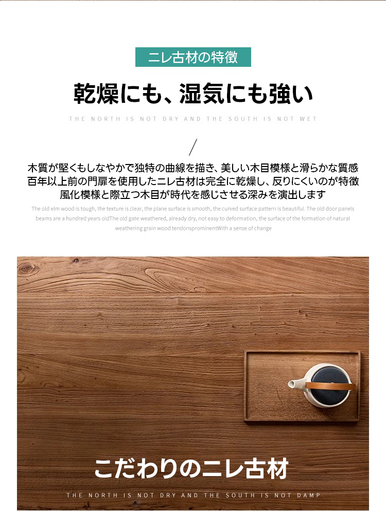- 【高品質な素材と職人技】ニレ古材を使用し、乾燥と湿気に強い特性を持っています。13年の経験を持つ職人が手掛けたこのテーブルは、15の工程を経て完成され、自然乾燥による独特の風合いと木目の美しさが魅力です。