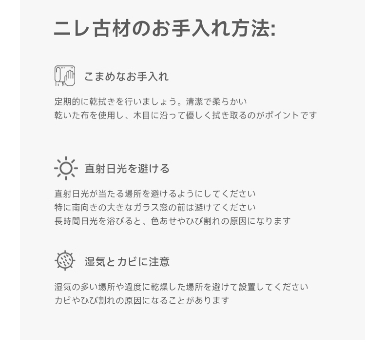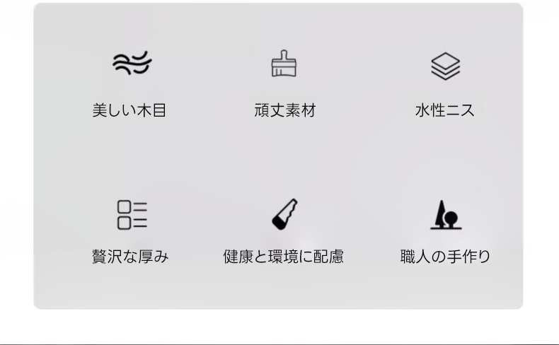 - 【自然の味わい】節や割れ、くぼみは素材の味わいとして楽しめ、自然素材の温かみを感じられる空間を演出します。環境に優しい水性塗料を使用し、健康にも配慮しています。