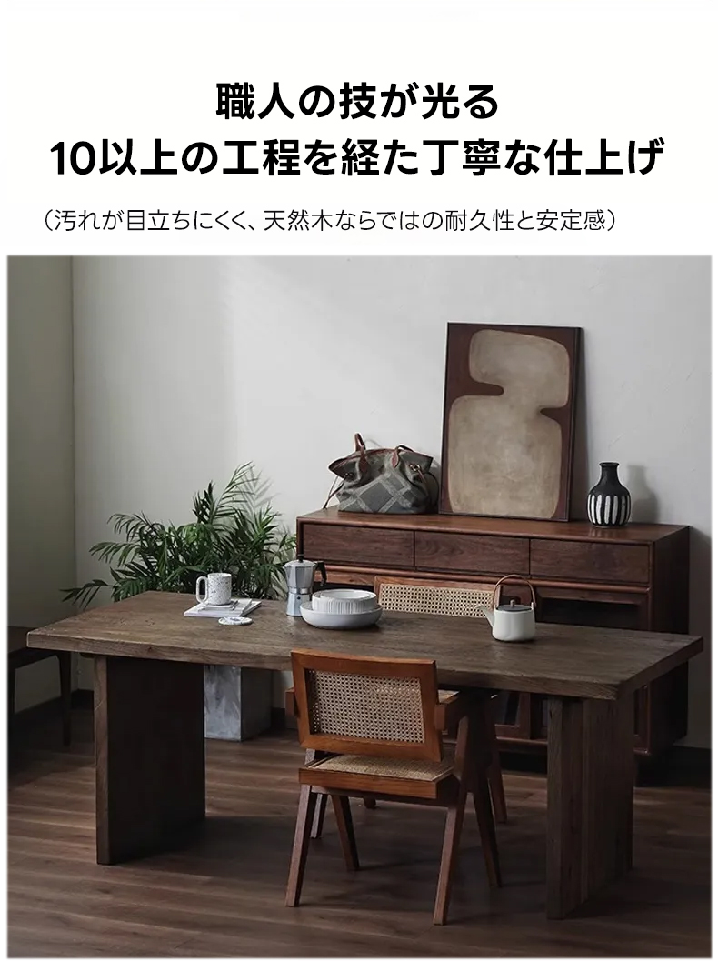 - 【職人の手作り】10以上の工程を経て丁寧に仕上げられたこのテーブルは、職人の技が光る逸品です。細部にまでこだわったデザインと高品質な仕上がりが特徴です。