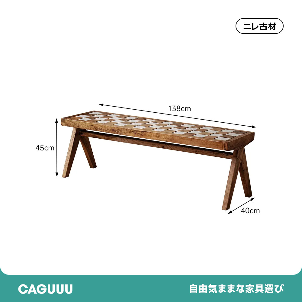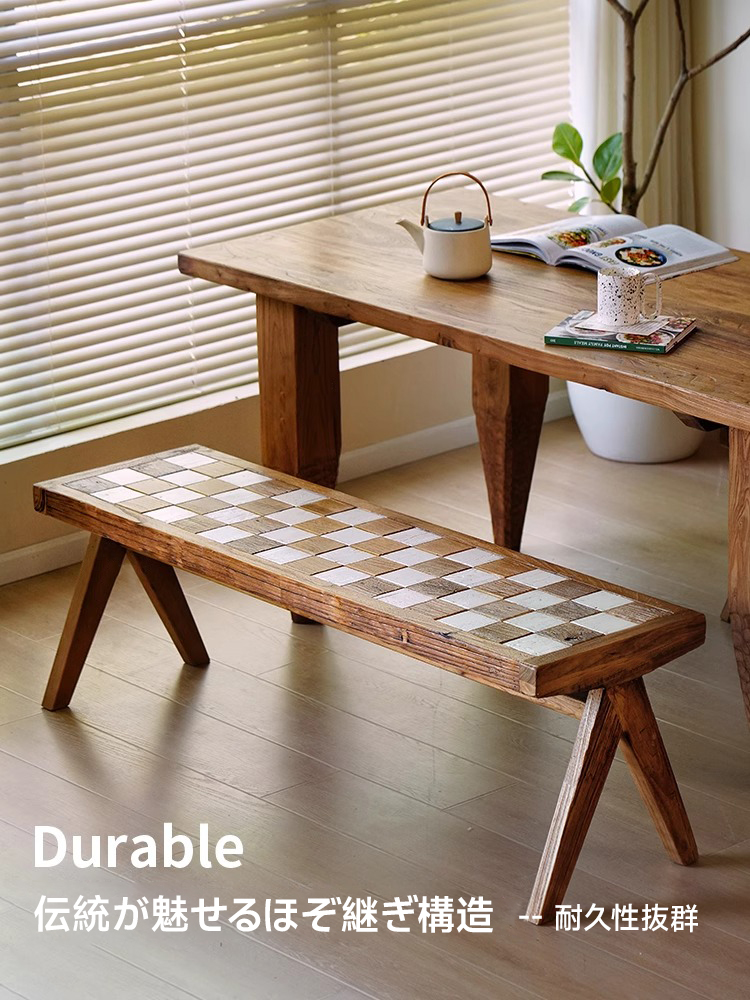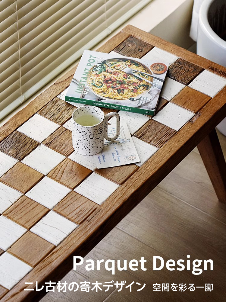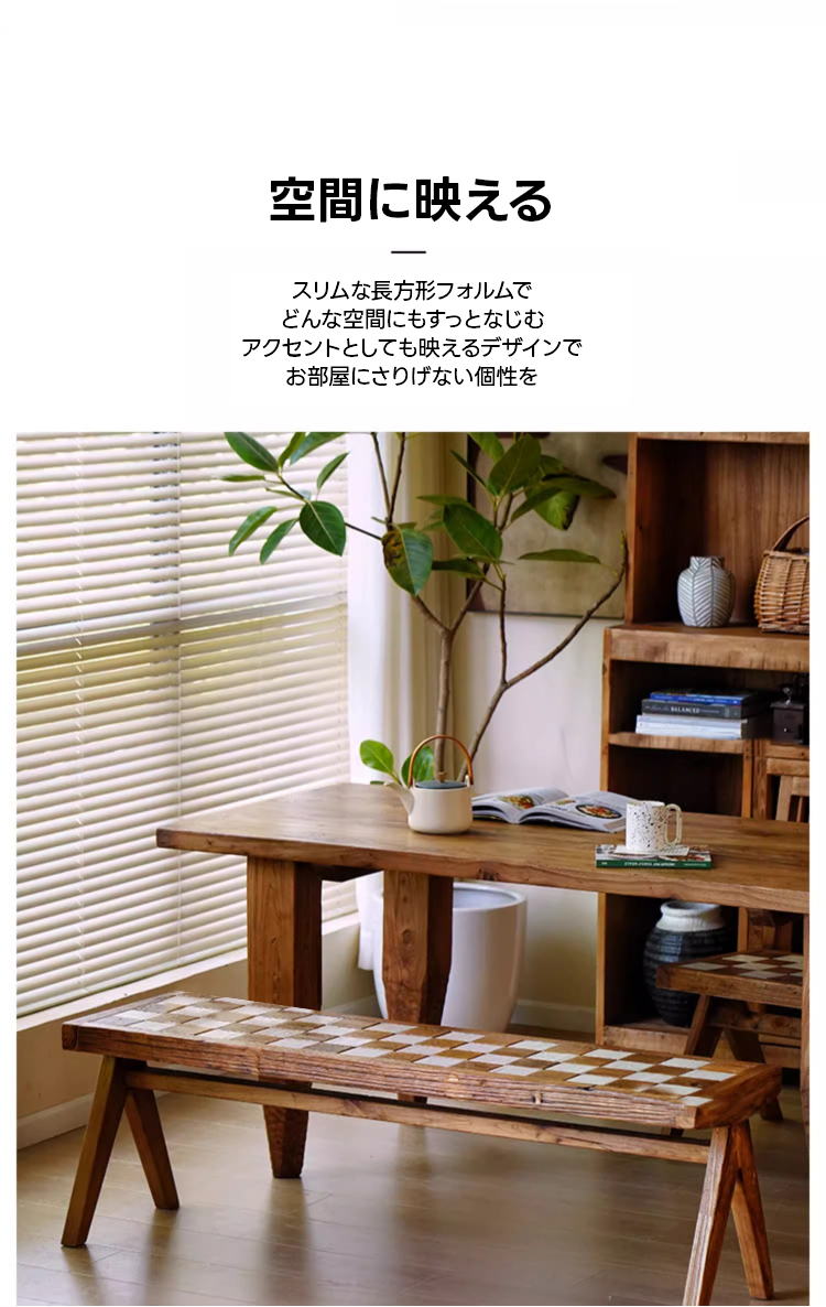 - 【優れたデザインと機能性】ニレ古材を使用した寄木デザインが特徴のロングベンチ。ナチュラルで温かみのある雰囲気を演出し、どんなインテリアにも調和します。長方形のスリムなフォルムで、玄関やエントランスにぴったりです。