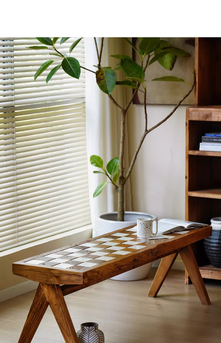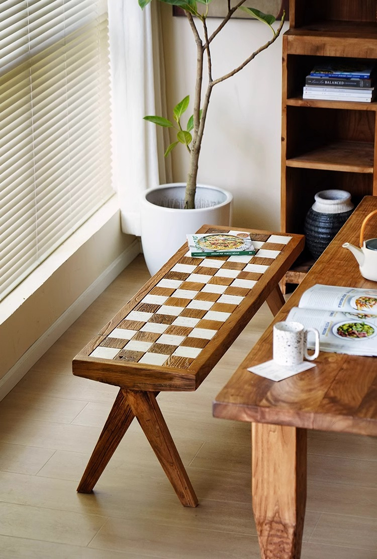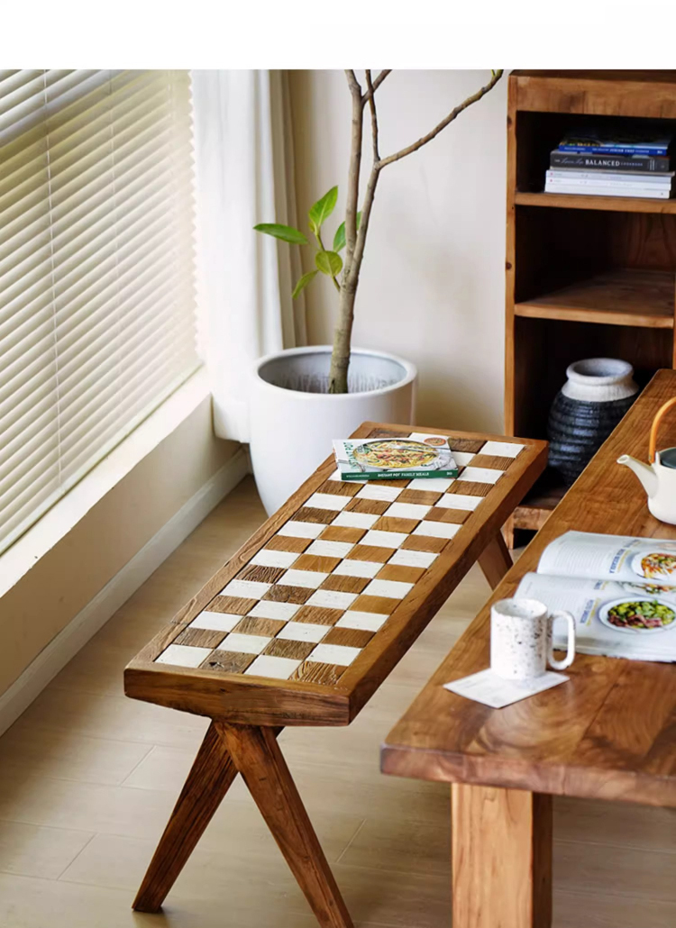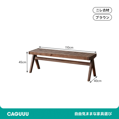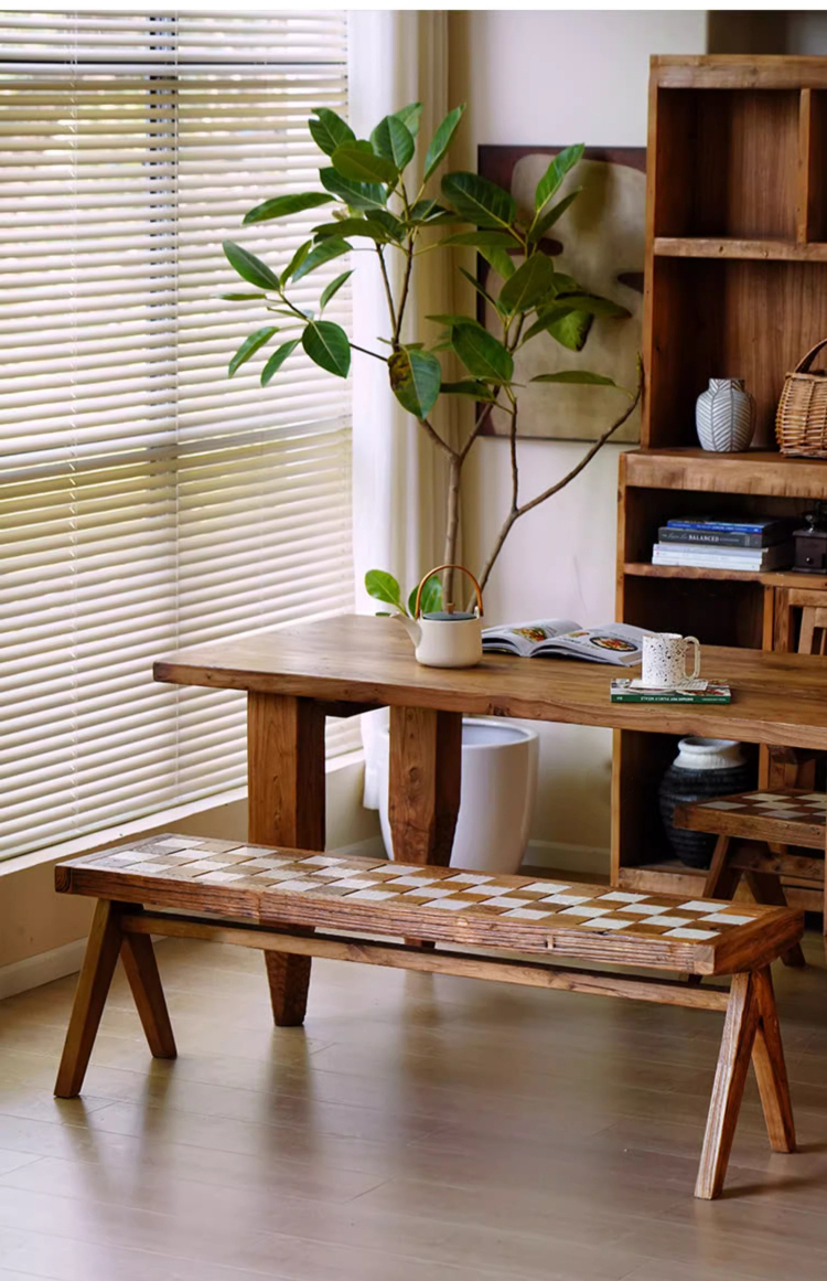 - 【優れたデザインと機能性】ニレ古材を使用した寄木デザインが特徴のロングベンチ。ナチュラルで温かみのある雰囲気を演出し、どんなインテリアにも調和します。長方形のスリムなフォルムで、玄関やエントランスにぴったりです。