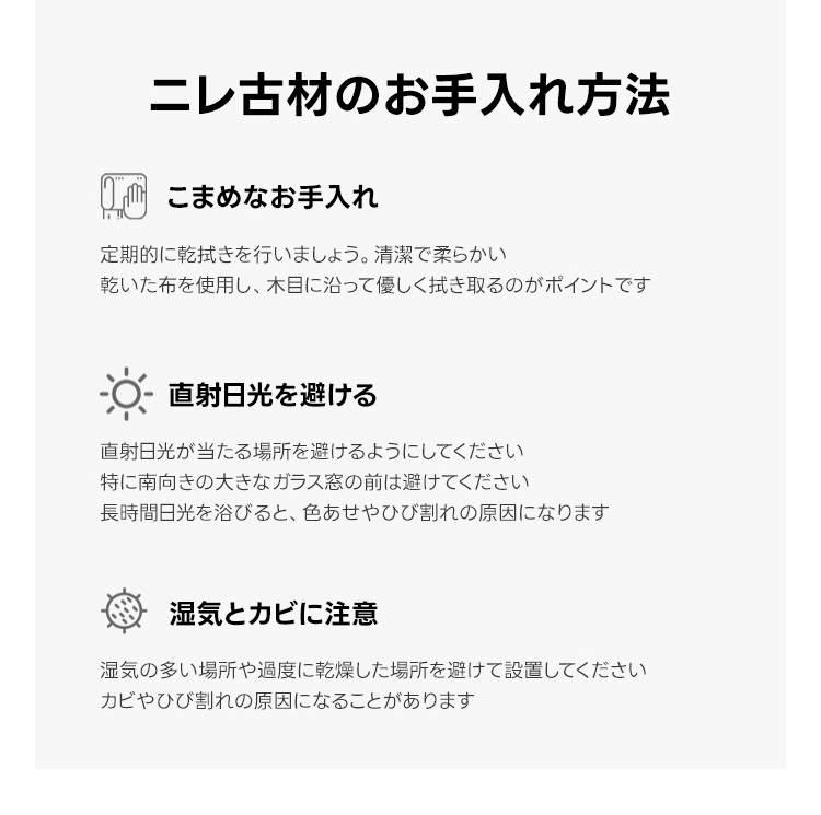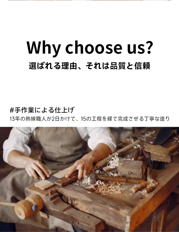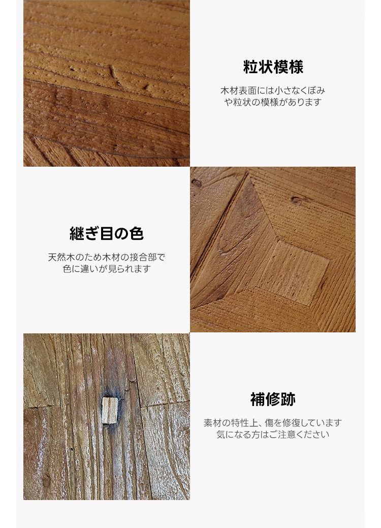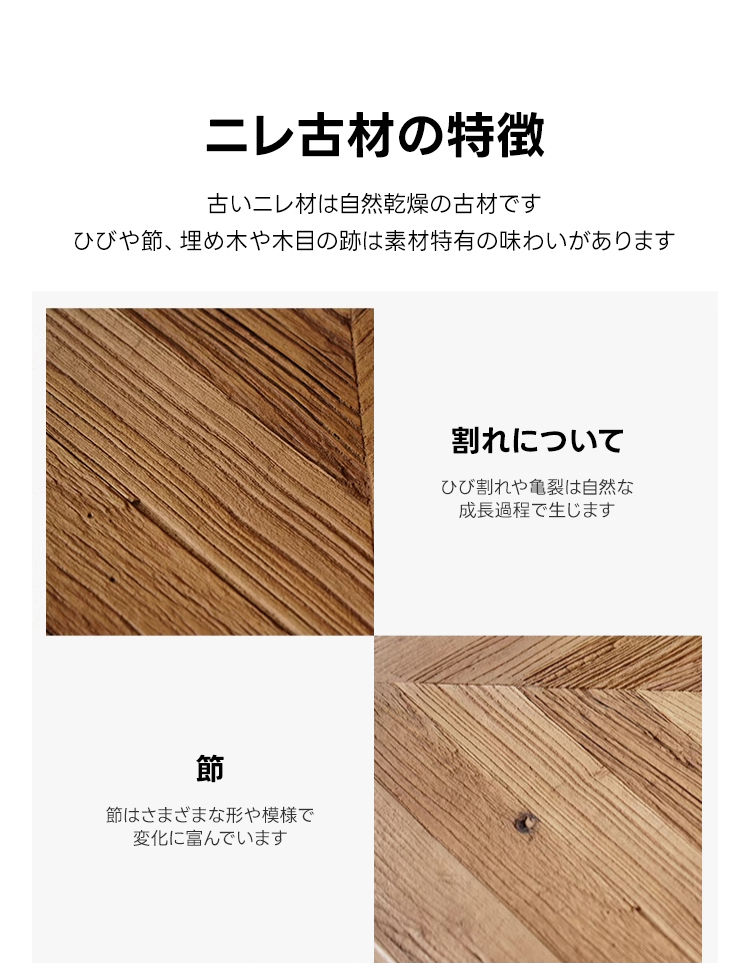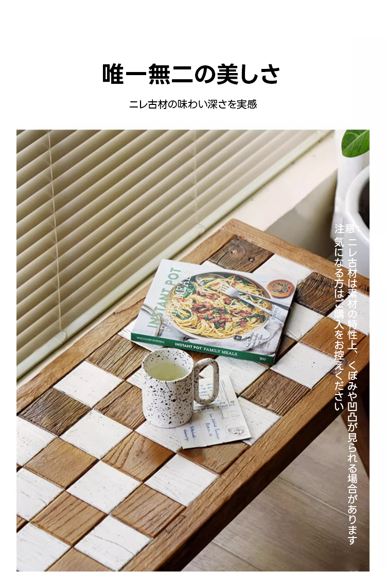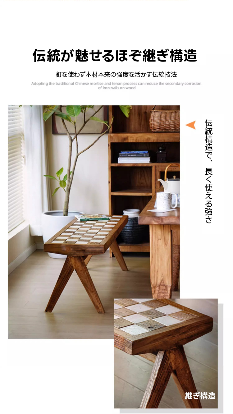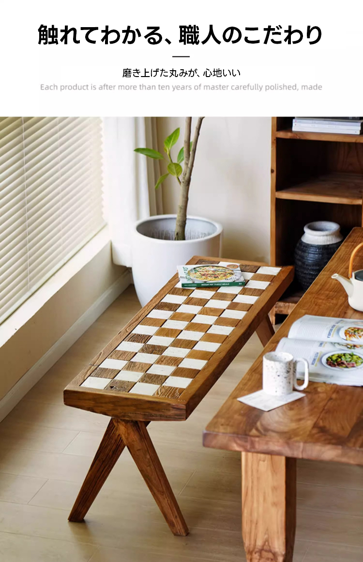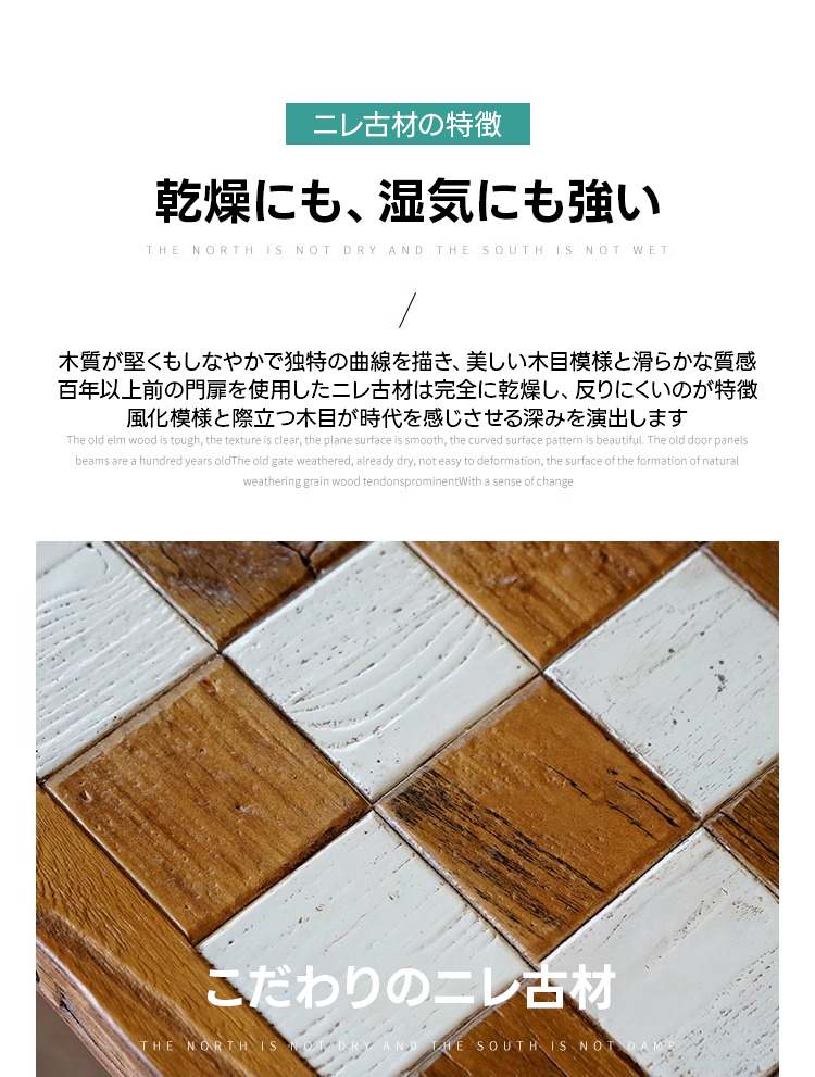 - 【高品質な素材と職人技】乾燥や湿気に強いニレ古材を使用し、13年の経験を持つ職人が手作業で仕上げました。15の工程を経て、滑らかな質感と独特の木目を持つ逸品です。