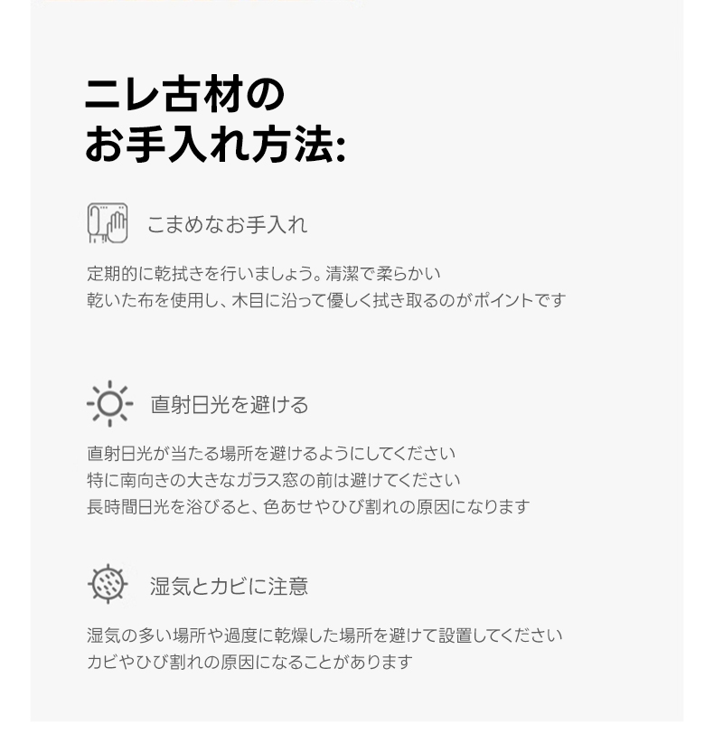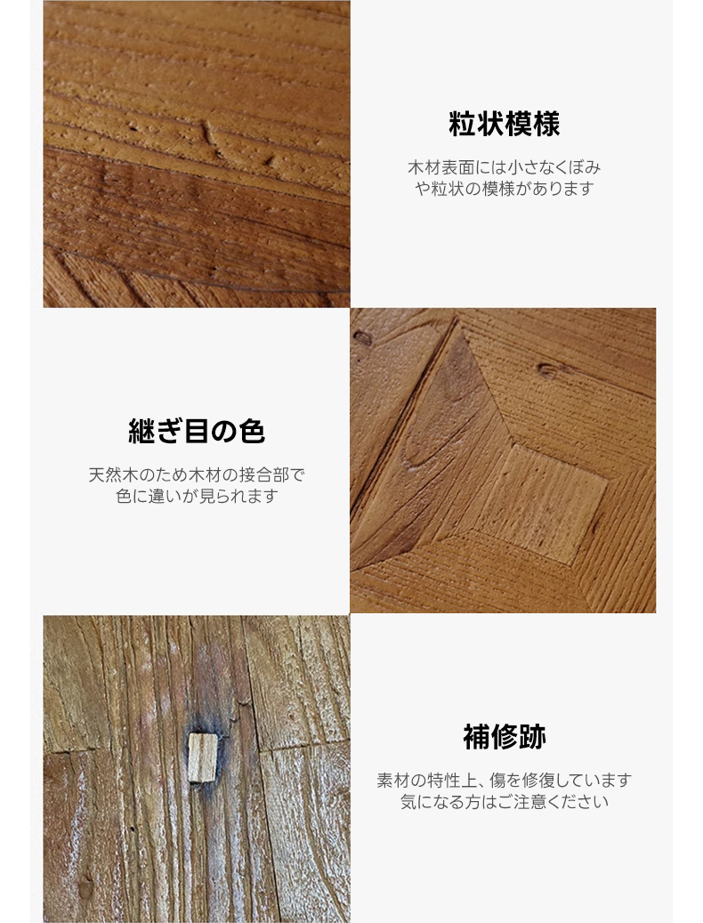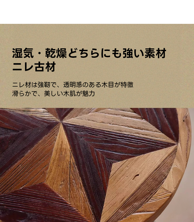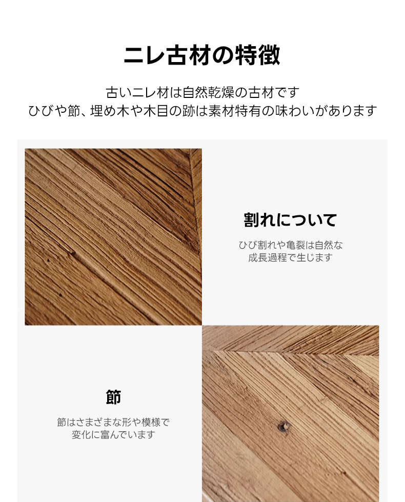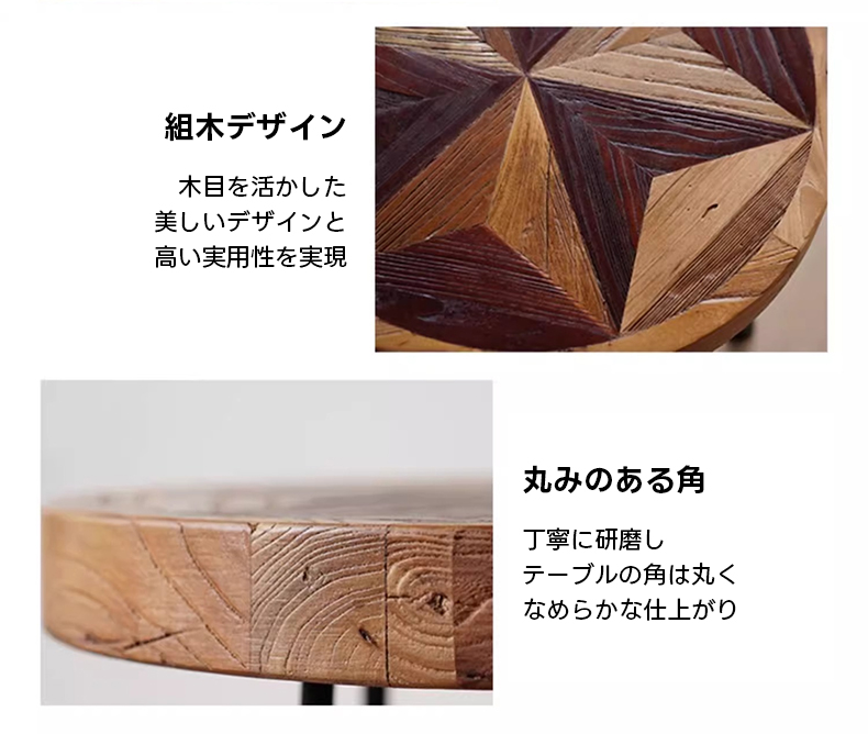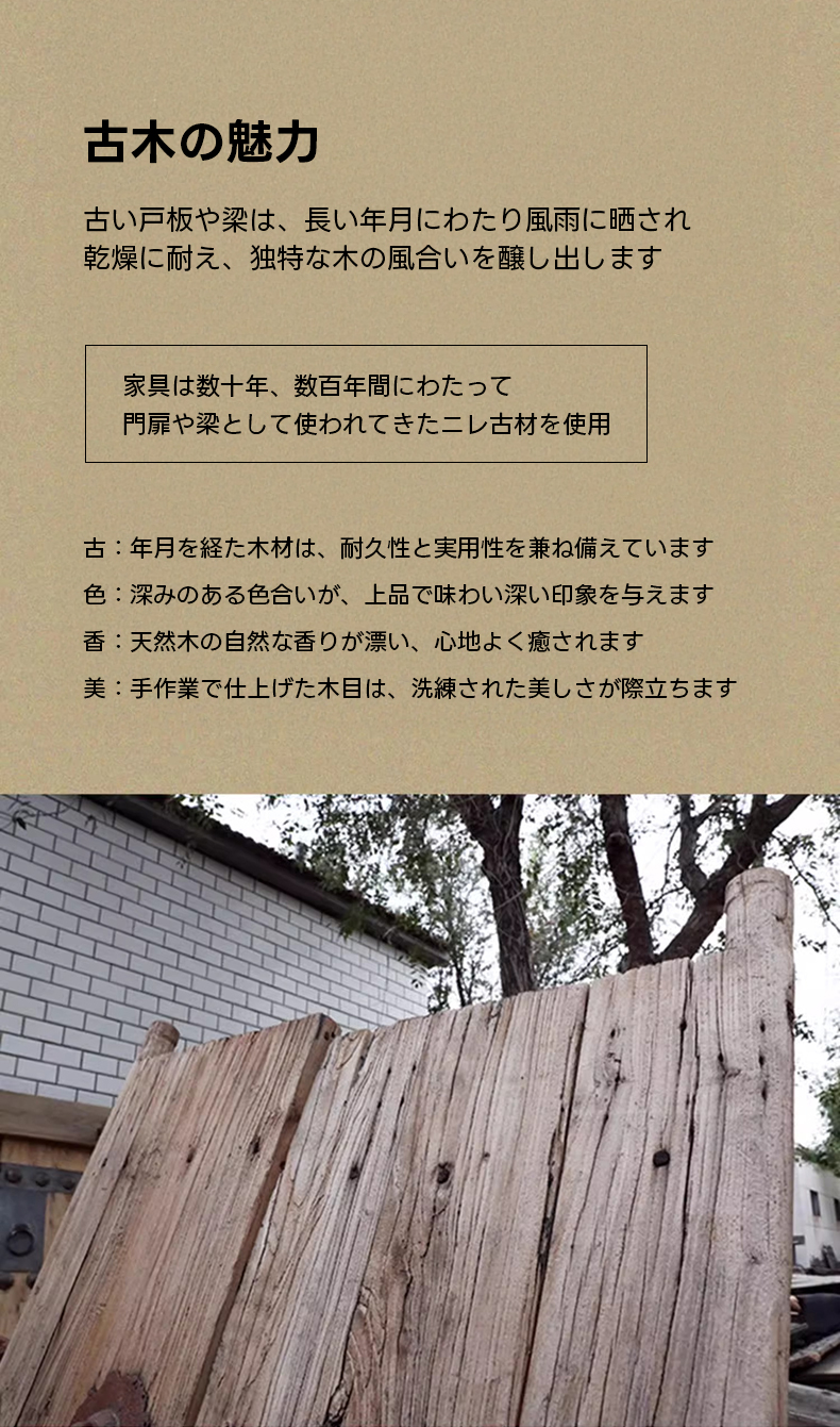 - 【高品質な素材と仕上げ】ニレ古材の自然な風合いと透明感のある木目が魅力。鋳鉄ベースは高い耐荷重性を持ち、長期間使用しても変形しにくい設計です。