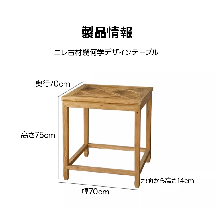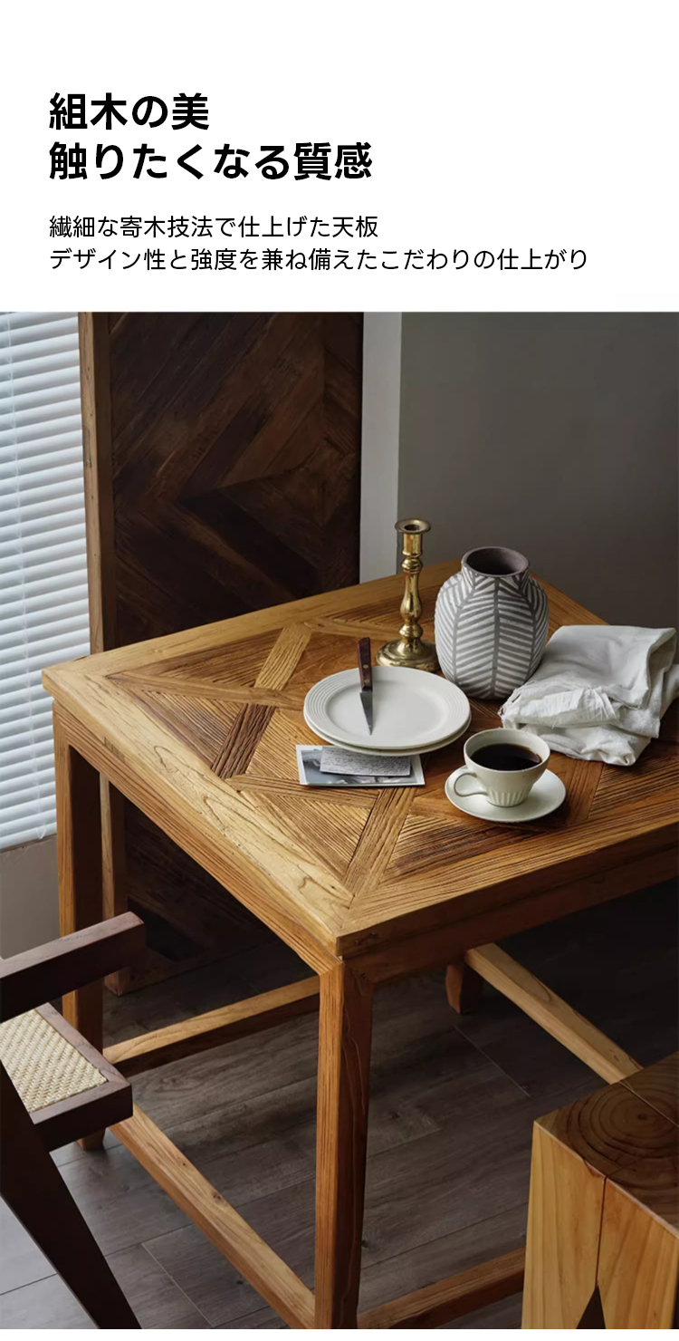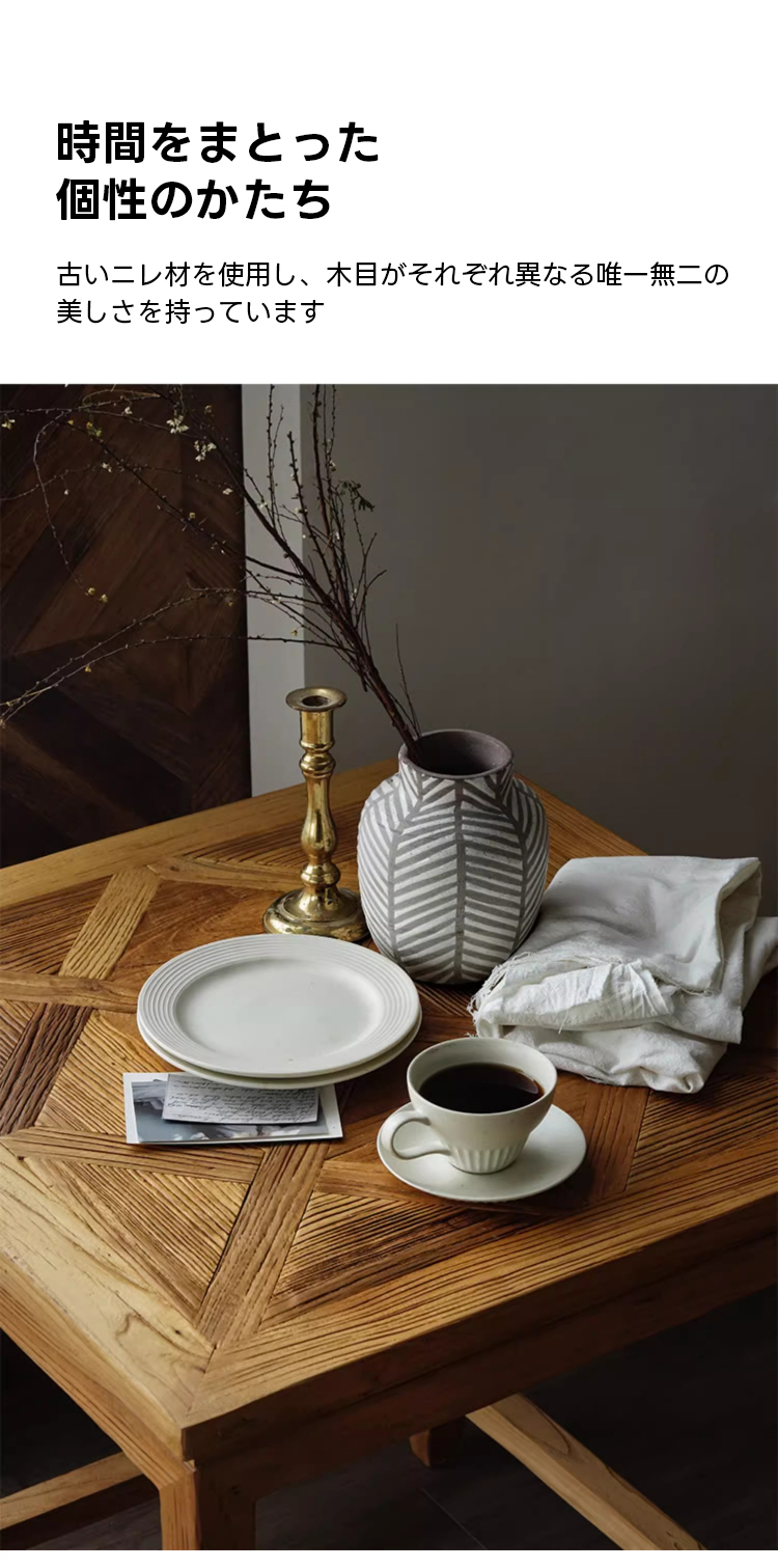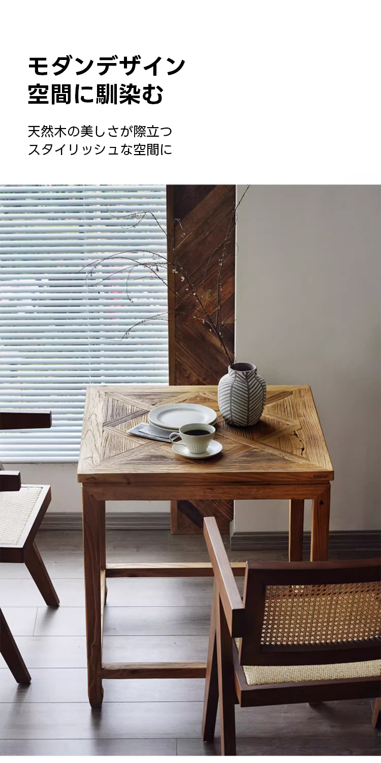 - 【多用途なダイニングテーブル】:ニレ古材を使用した幾何学デザインが特徴のこのテーブルは、リビングやダイニングに調和し、勉強や食事、読書など多様なシーンで活躍します。ナチュラルなベージュ色がどんなインテリアにもマッチし、空間をおしゃれに演出します。