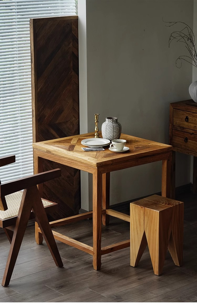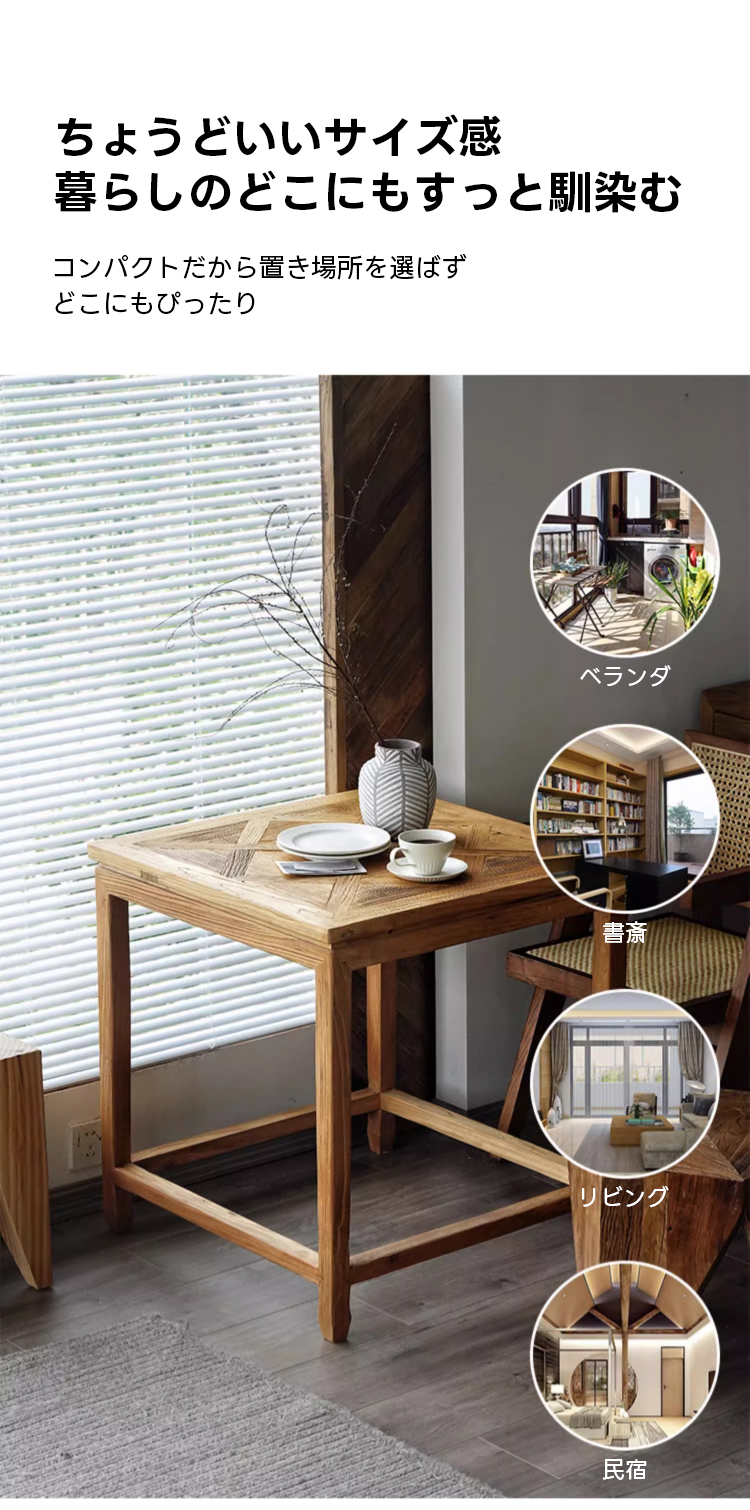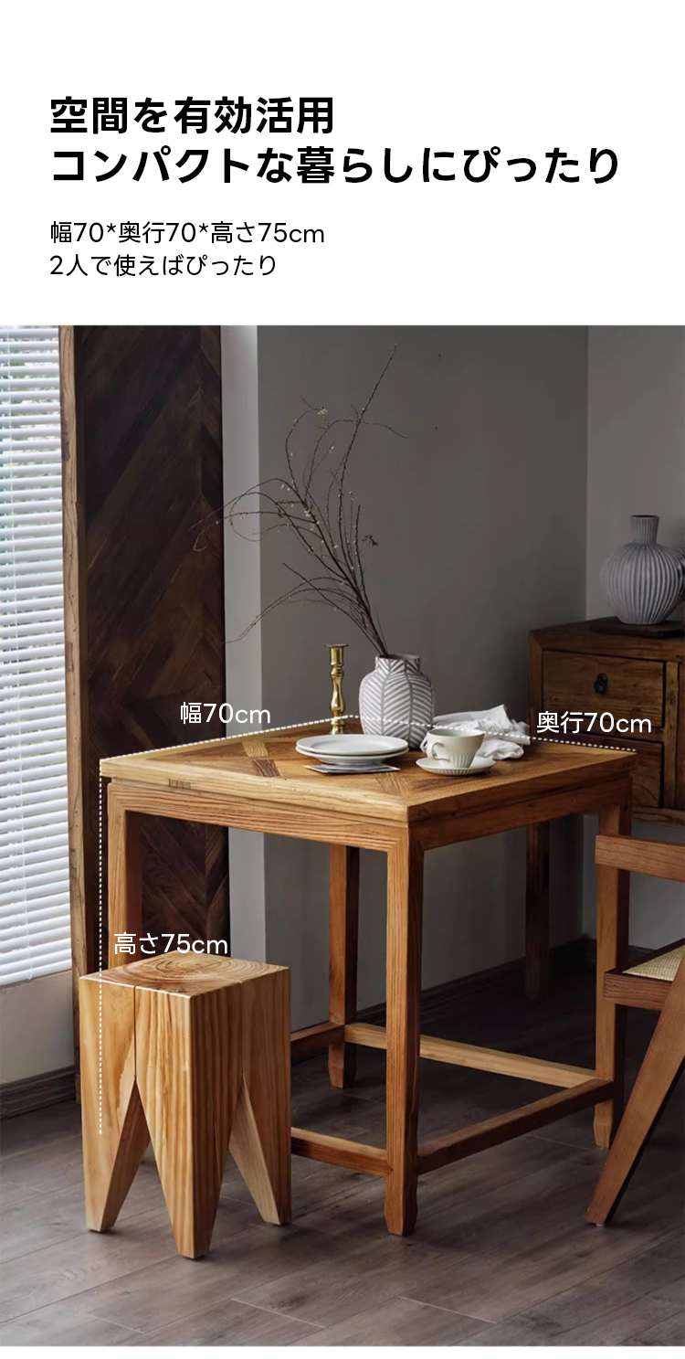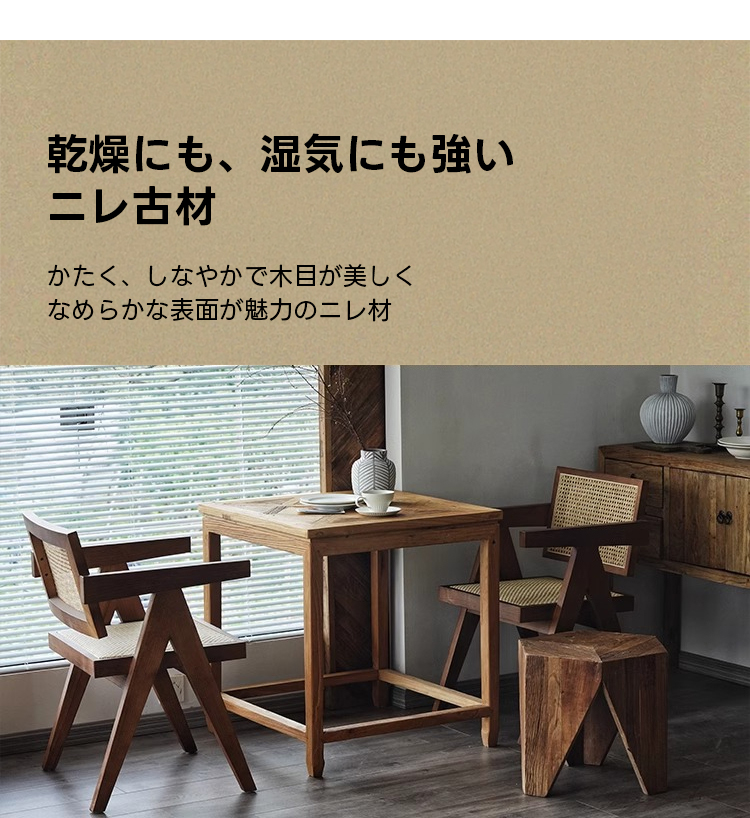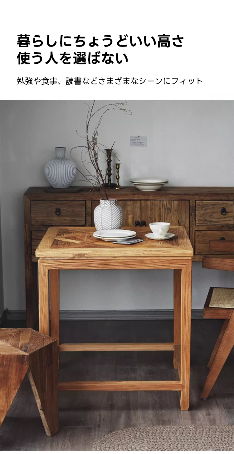 - 【多用途なダイニングテーブル】:ニレ古材を使用した幾何学デザインが特徴のこのテーブルは、リビングやダイニングに調和し、勉強や食事、読書など多様なシーンで活躍します。ナチュラルなベージュ色がどんなインテリアにもマッチし、空間をおしゃれに演出します。