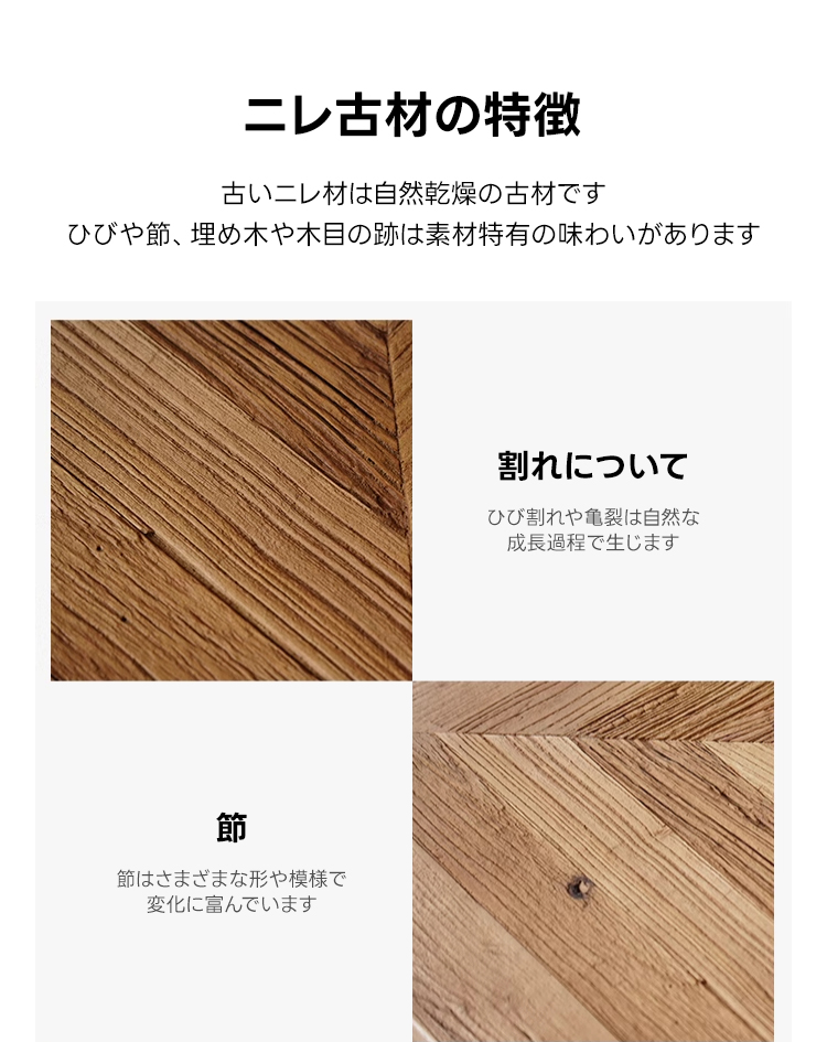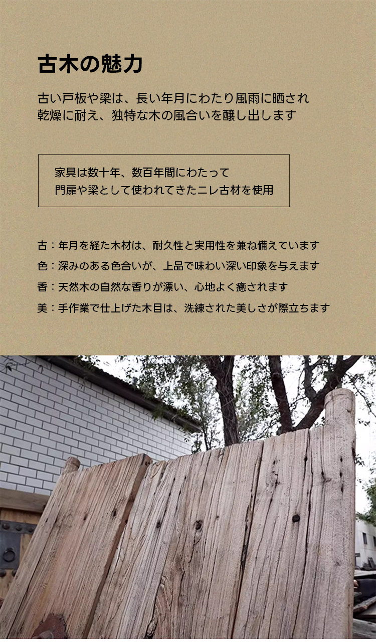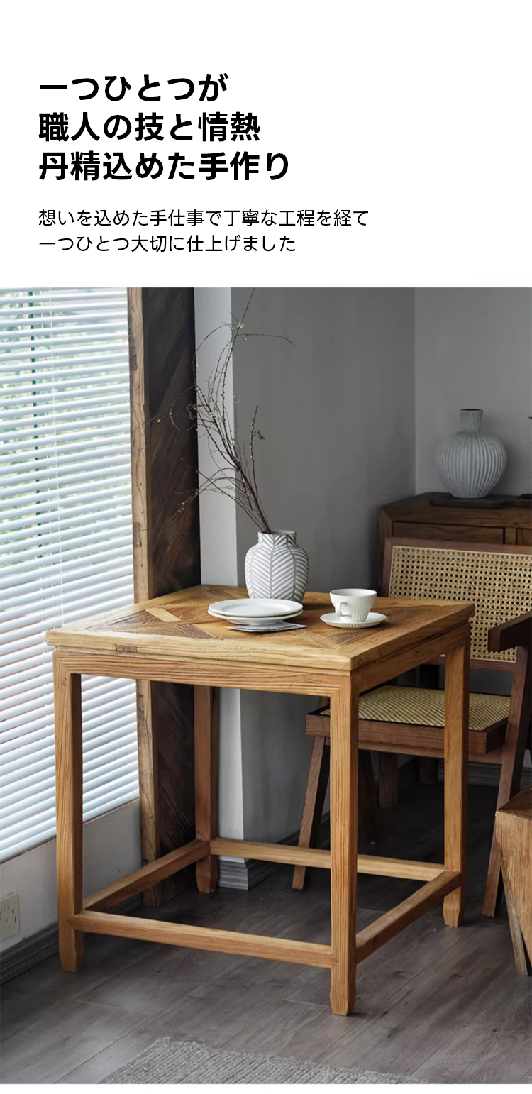 - 【高品質な素材と職人技】:ニレ古材を使用し、耐久性に優れたこのテーブルは、13年の経験を持つ熟練職人が手作業で仕上げました。15の工程を経て完成した丁寧な造りで、自然な木目の美しさと温かみを感じられます。