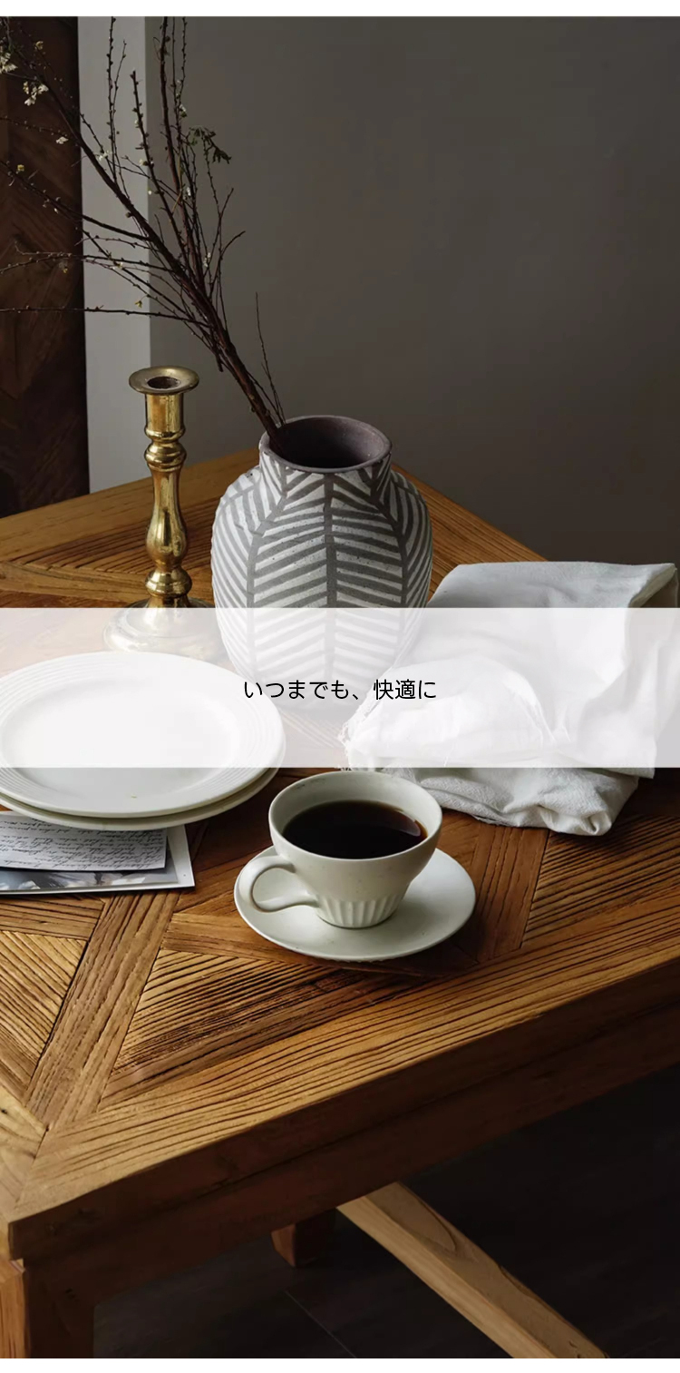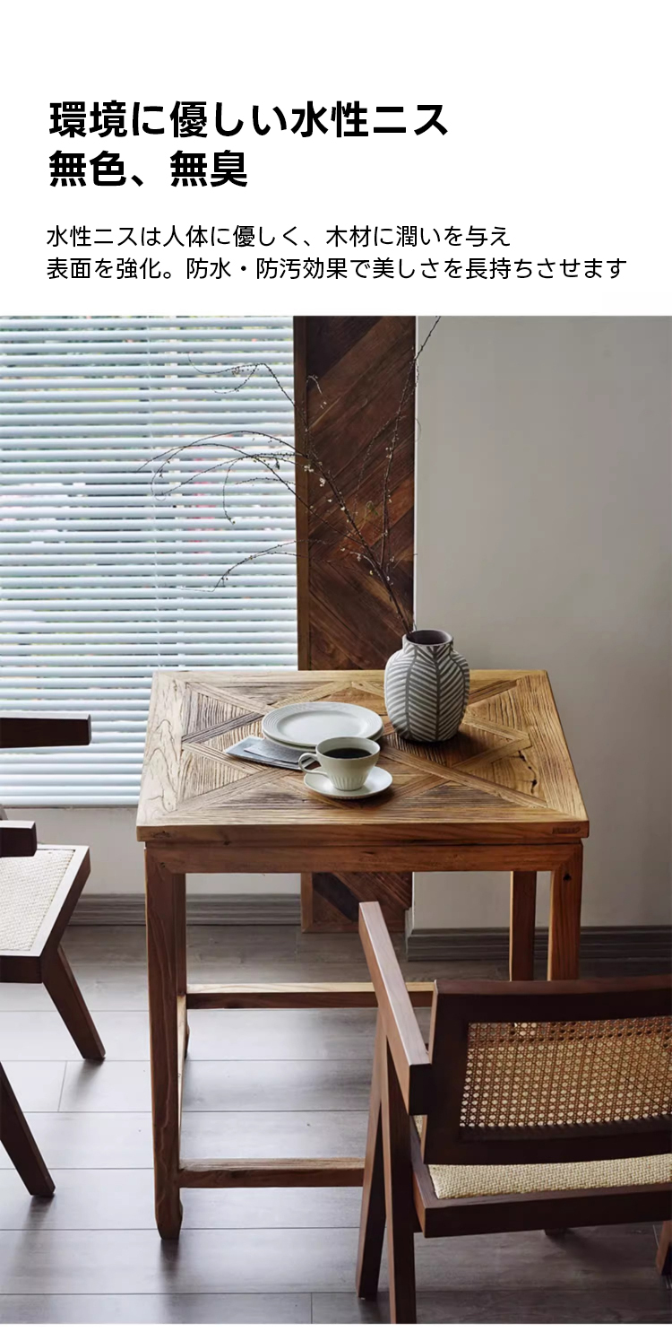 - 【環境に優しい仕上げ】:無色・無臭の水性ニスを使用し、環境に配慮した仕上げが施されています。木材に潤いを与えながら表面を強化し、長く美しい状態を保ちます。安心してお使いいただけるエコフレンドリーなテーブルです。
