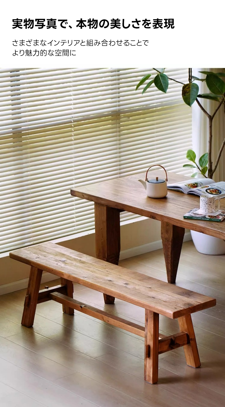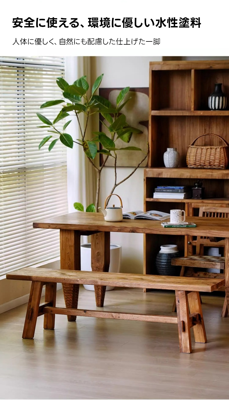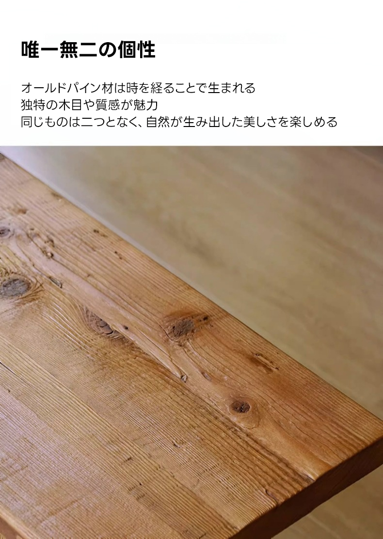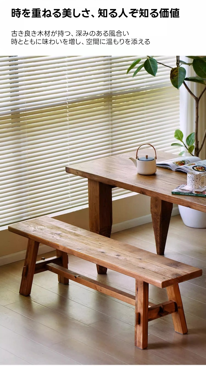 - 【耐久性とデザインの融合】:オールドパイン材を使用したクラシックウッドベンチは、耐久性と美しいデザインを兼ね備えています。ナチュラルなブラウンの色合いと深みのある木目が、どんなインテリアにも自然に溶け込みます。