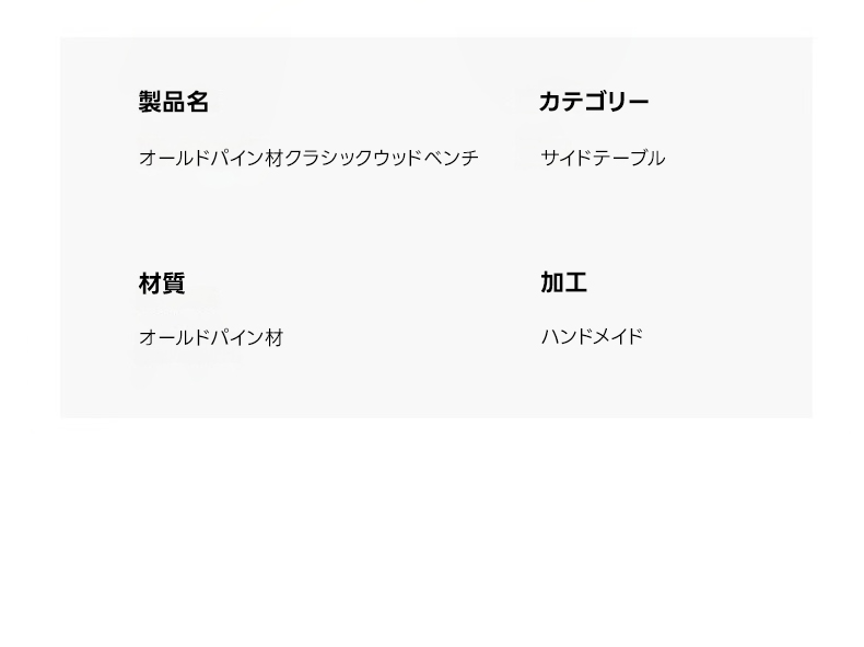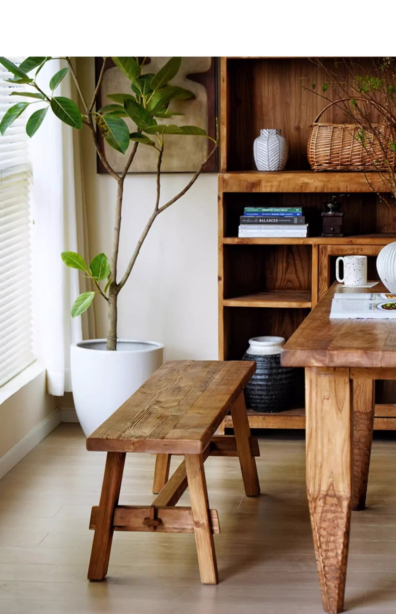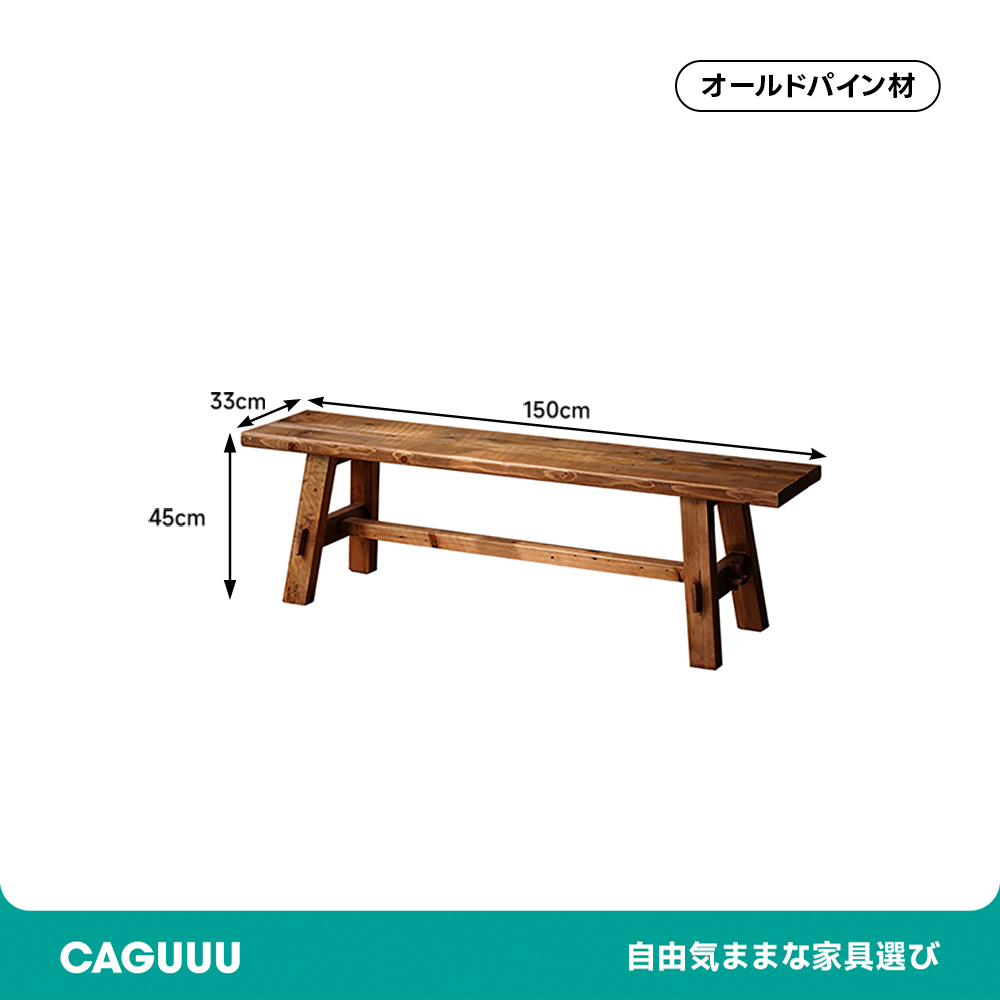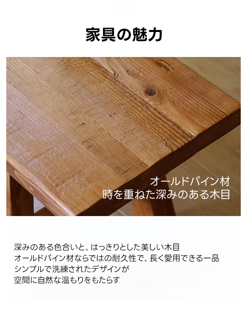 - 【耐久性とデザインの融合】:オールドパイン材を使用したクラシックウッドベンチは、耐久性と美しいデザインを兼ね備えています。ナチュラルなブラウンの色合いと深みのある木目が、どんなインテリアにも自然に溶け込みます。