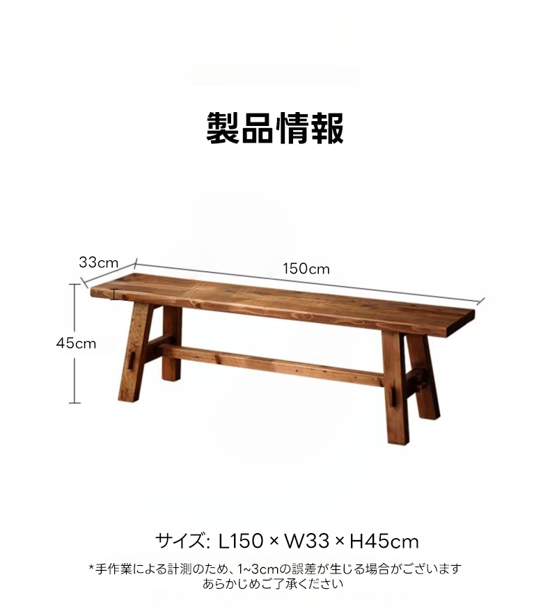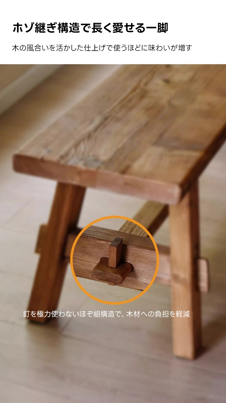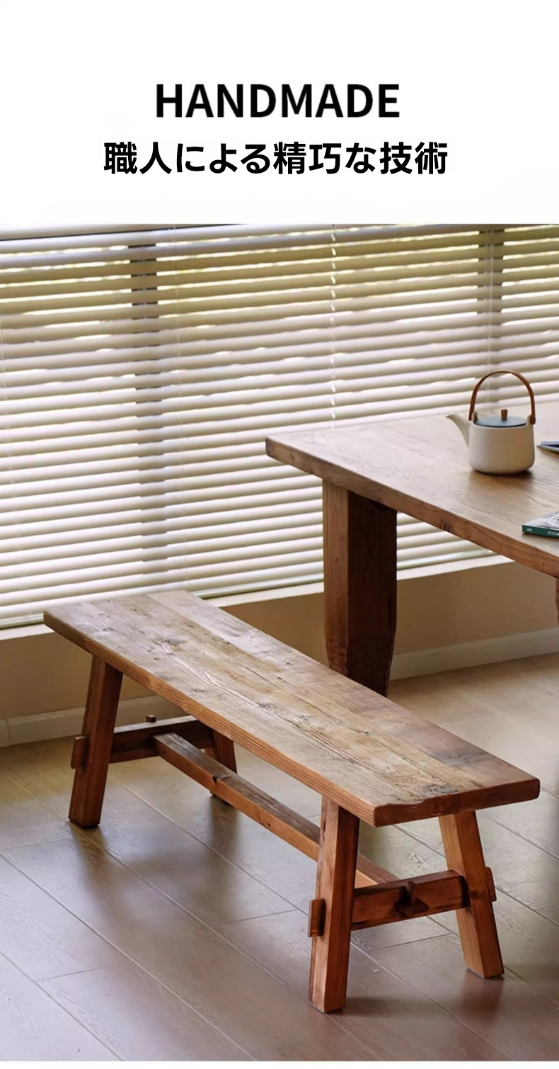 - 【職人技の結晶】:13年の熟練職人が手作業で仕上げたこのベンチは、15の工程を経て完成。釘を極力使用しないホゾ継ぎ構造で、木材への負担を軽減し、長くご愛用いただけます。