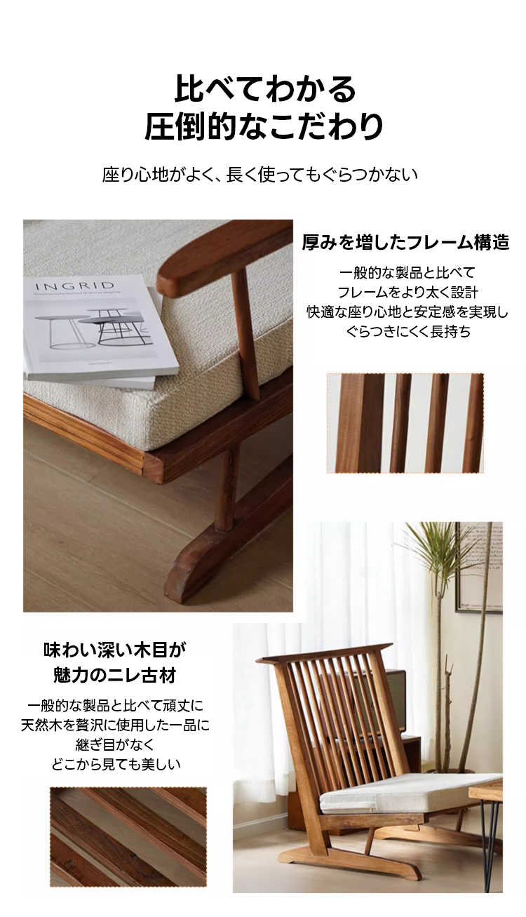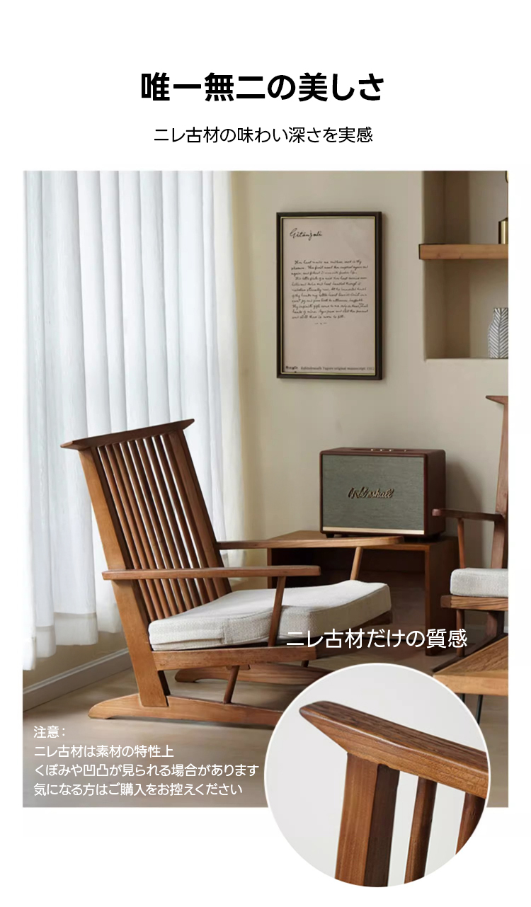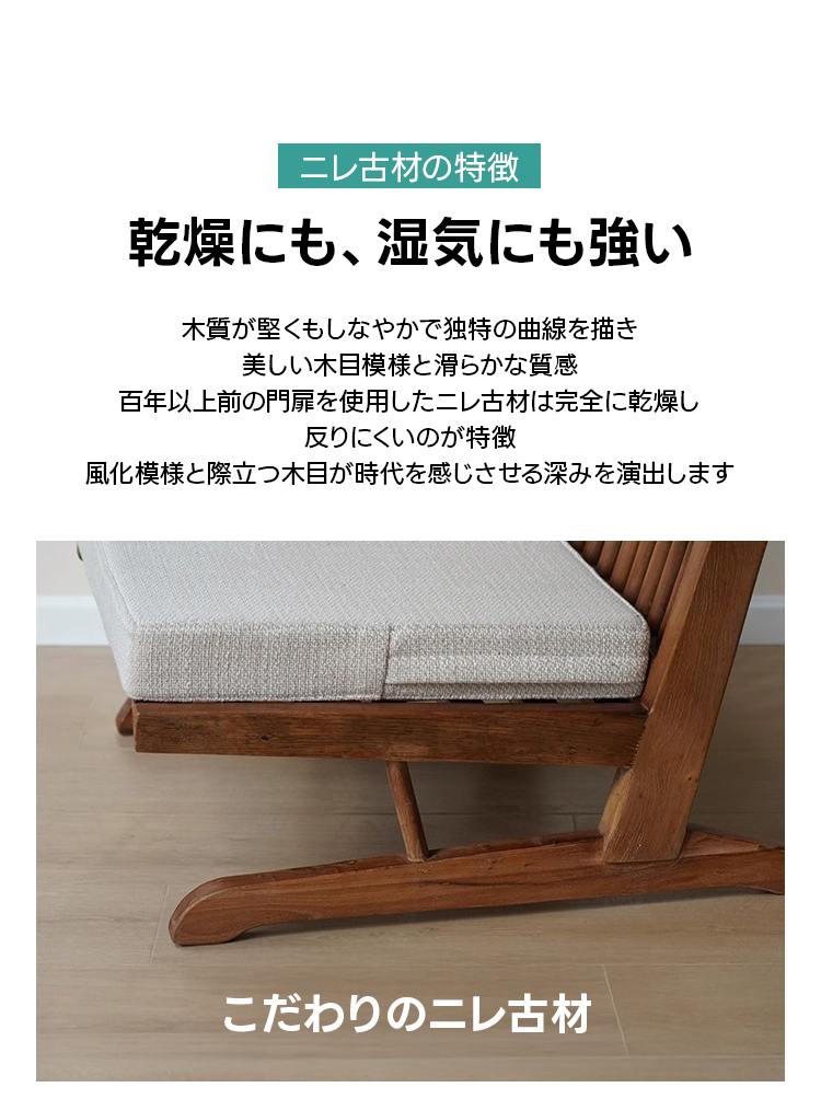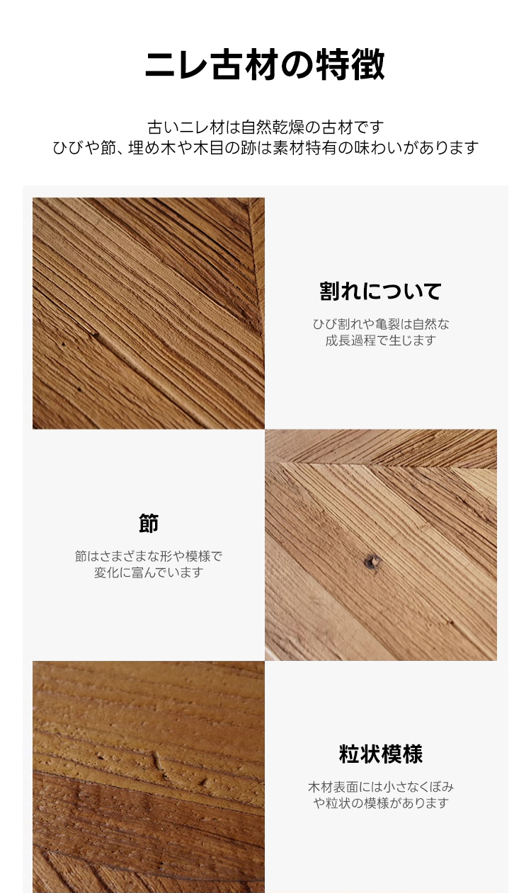 - 【高品質な素材とデザイン】:ニレ古材を使用し、乾燥や湿気に強い特性を持っています。伝統的な技法を活かした継ぎ構造で、釘を使わず木材本来の強度を活かしています。美しい木目模様と滑らかな質感が魅力です。