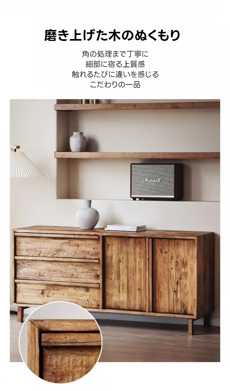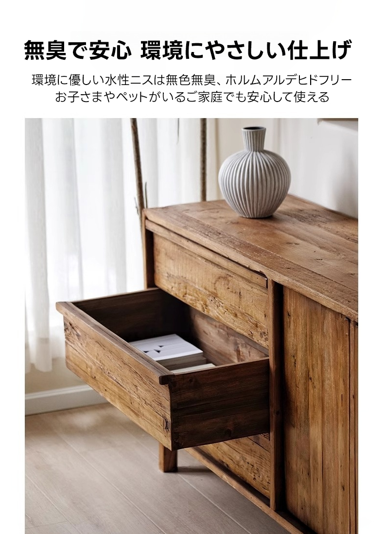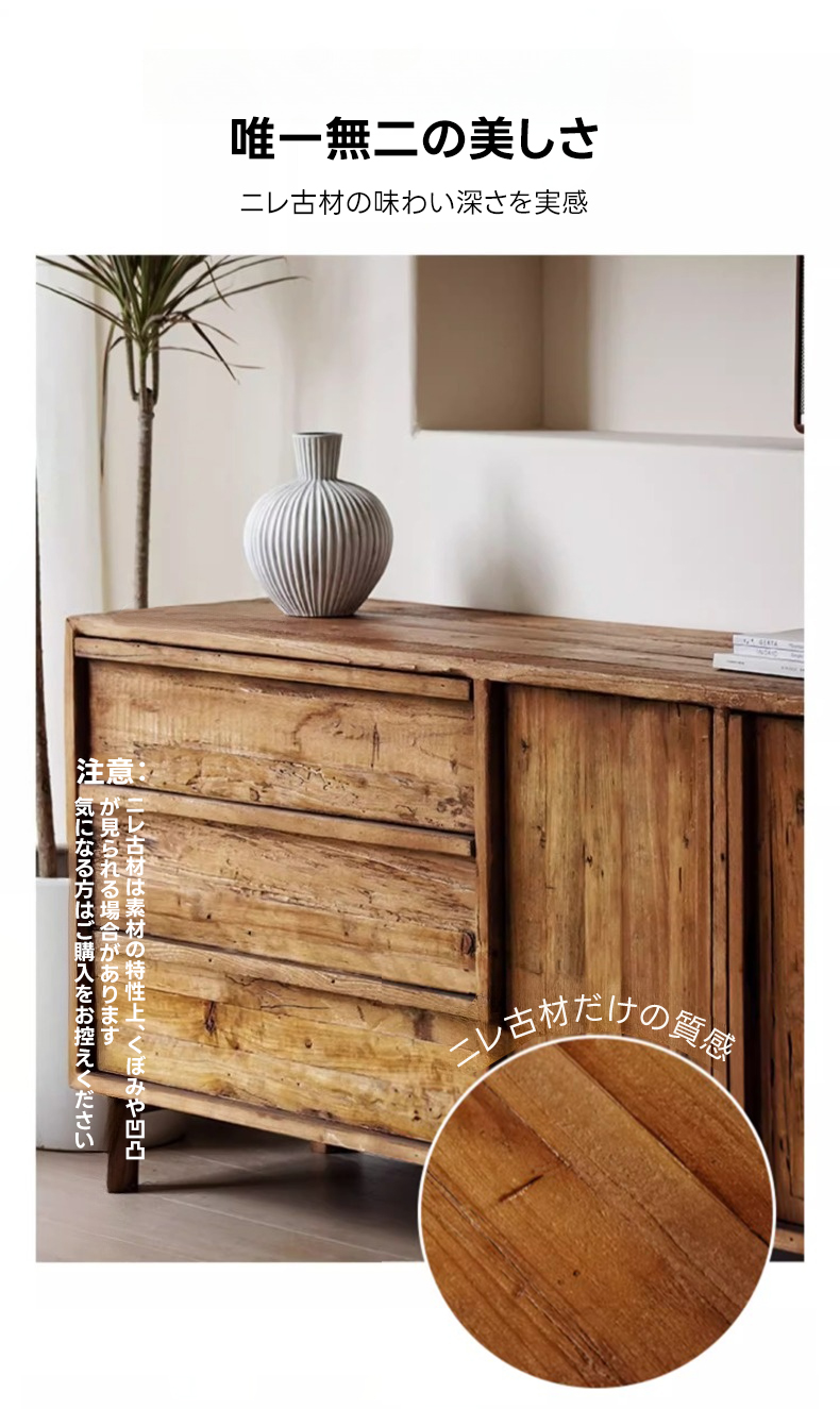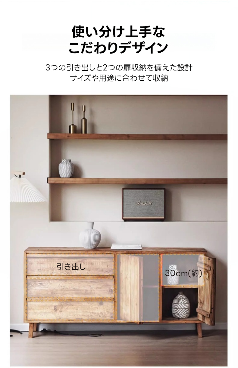 - 【優れた収納力とデザイン】このニレ古材サイドボードは、3つの引き出しと2つの扉収納を備え、効率的な収納が可能です。どんな空間にもなじむ上品なデザインで、リビングルームをスタイリッシュに演出します。