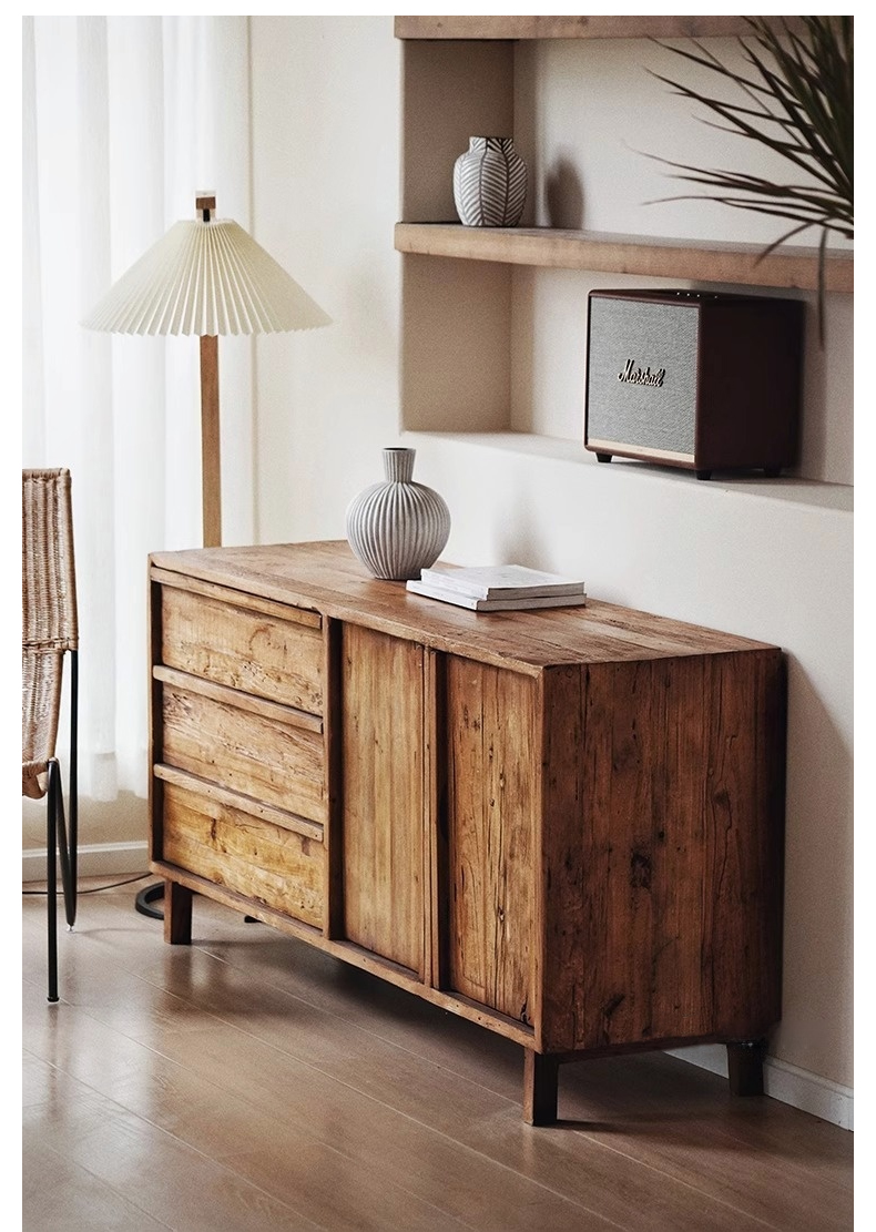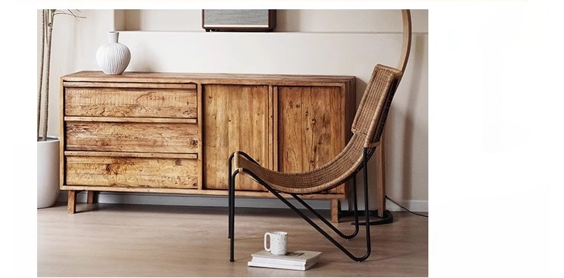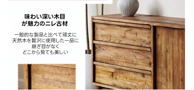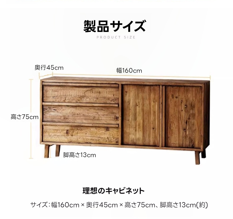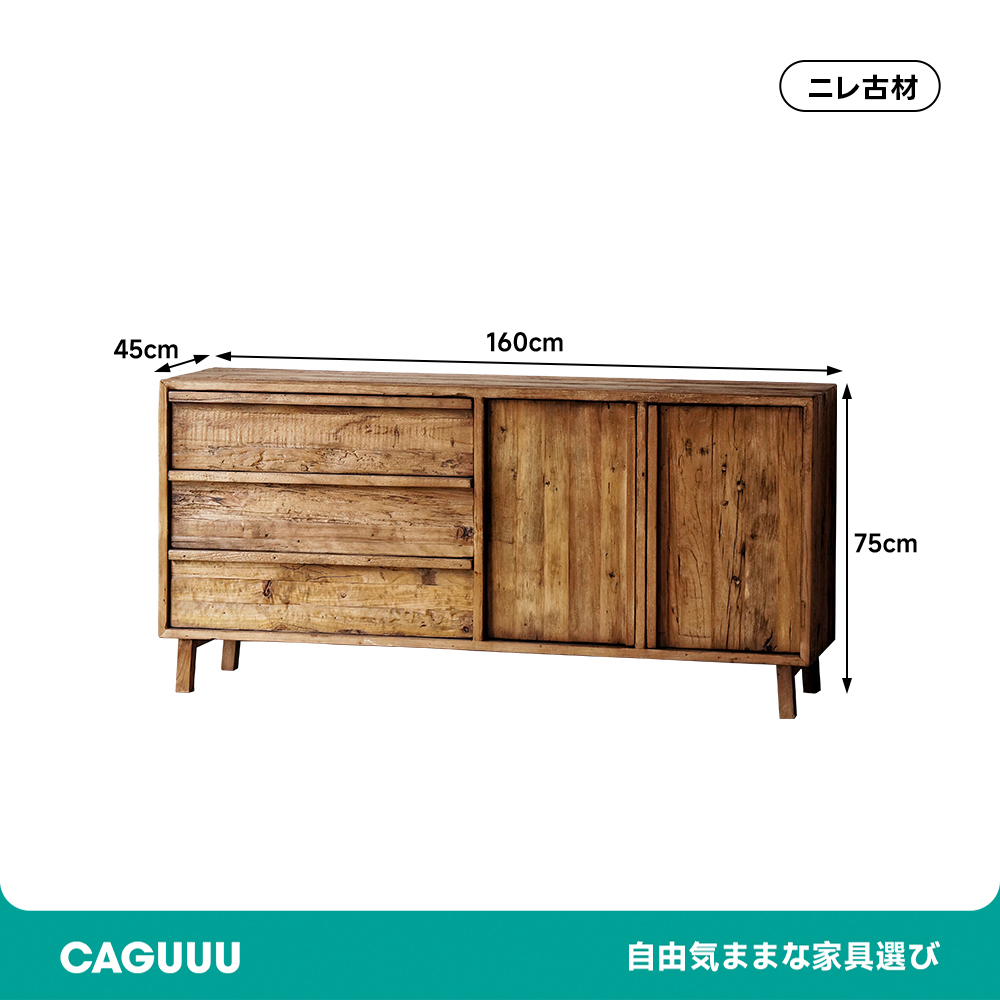 - 【優れた収納力とデザイン】このニレ古材サイドボードは、3つの引き出しと2つの扉収納を備え、効率的な収納が可能です。どんな空間にもなじむ上品なデザインで、リビングルームをスタイリッシュに演出します。