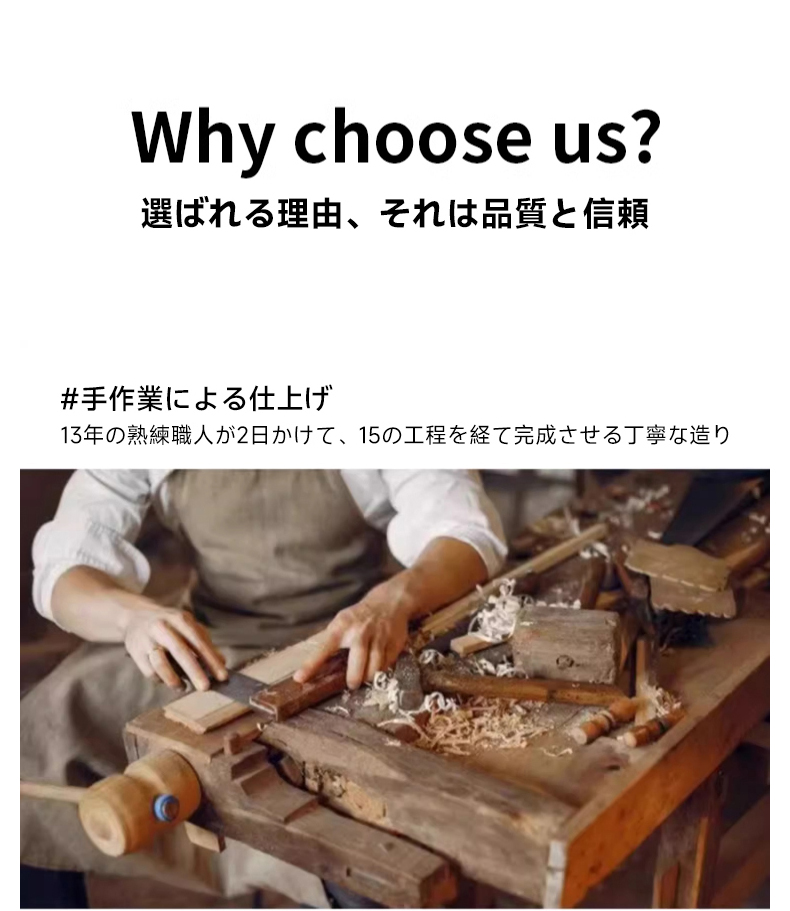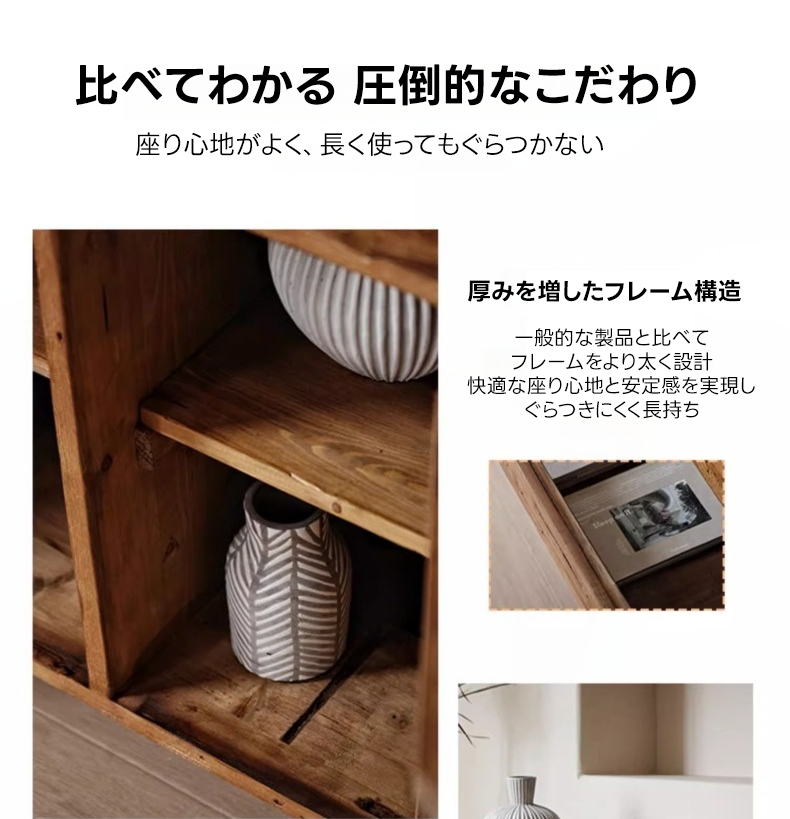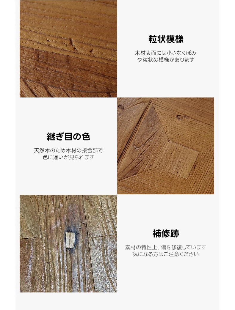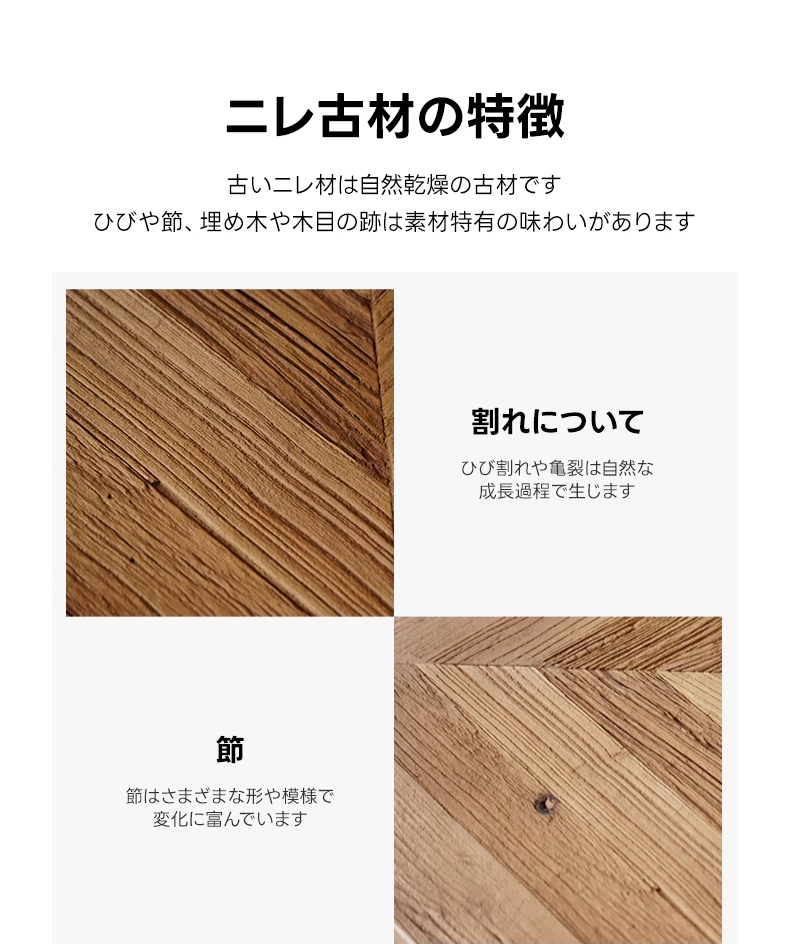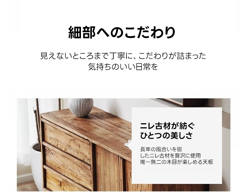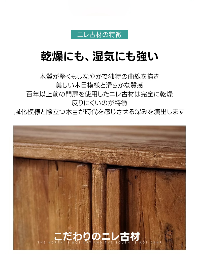 - 【高品質な素材と職人技】ニレ古材を使用し、13年の経験を持つ職人が丁寧に仕上げた一品です。乾燥や湿気に強い特性を持ち、美しい木目模様と滑らかな質感が特徴です。