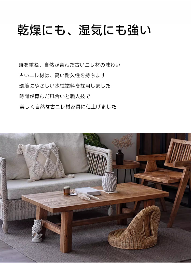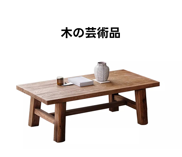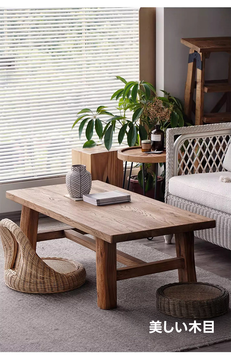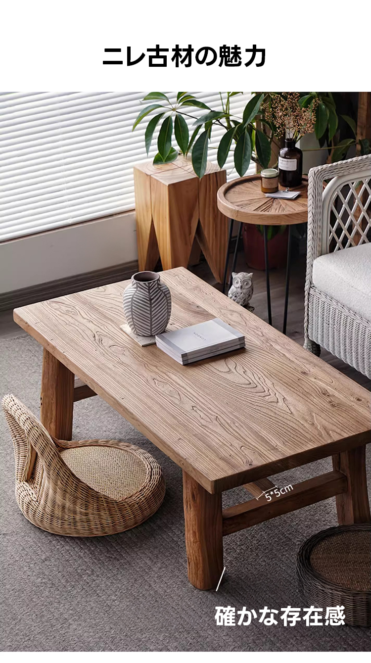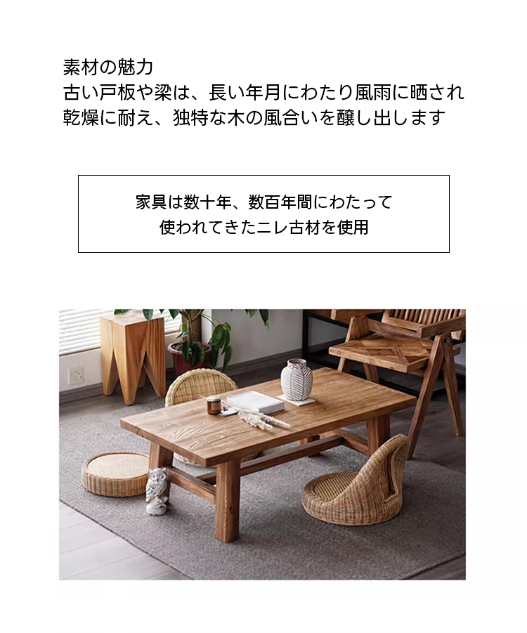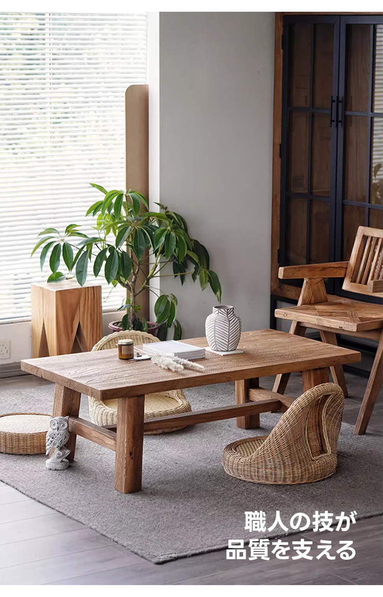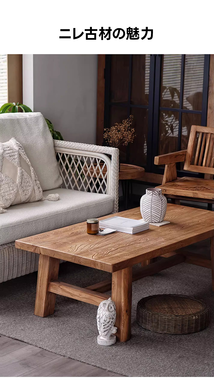 - 【ヴィンテージスタイルの魅力】:ニレ古材を使用したヴィンテージローテーブルは、リビングに自然な温かみをもたらします。ナチュラルでブラウンの色合いが特徴的で、どんなインテリアにも調和します。