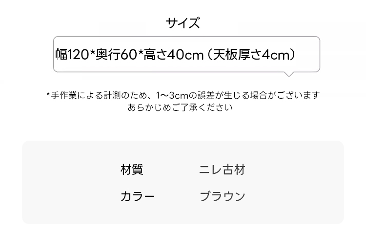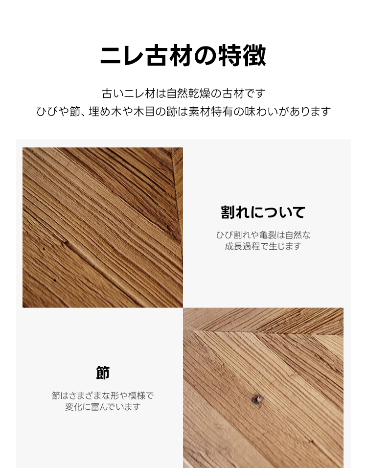- 【自然素材の特性】:ニレ古材は、長年の風雨に耐えた独特な風合いを持ち、乾燥や湿気にも強い特性があります。定期的な乾拭きと直射日光を避けることで、美しい状態を保てます。