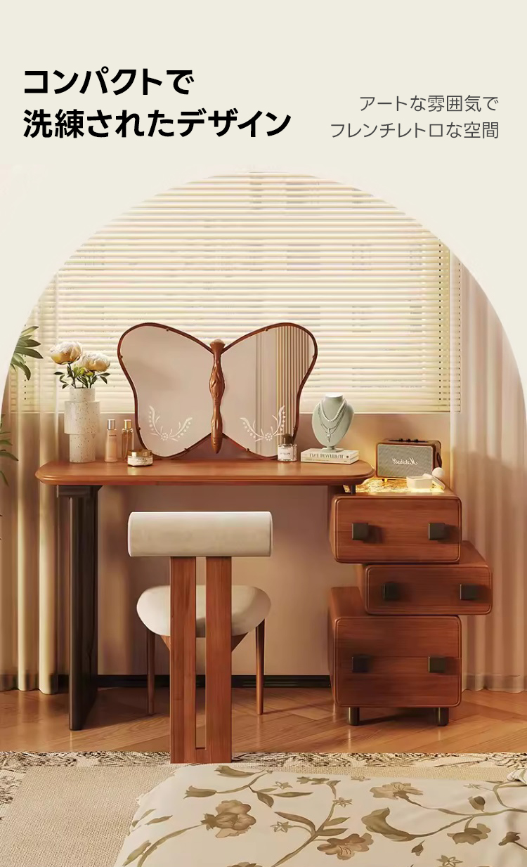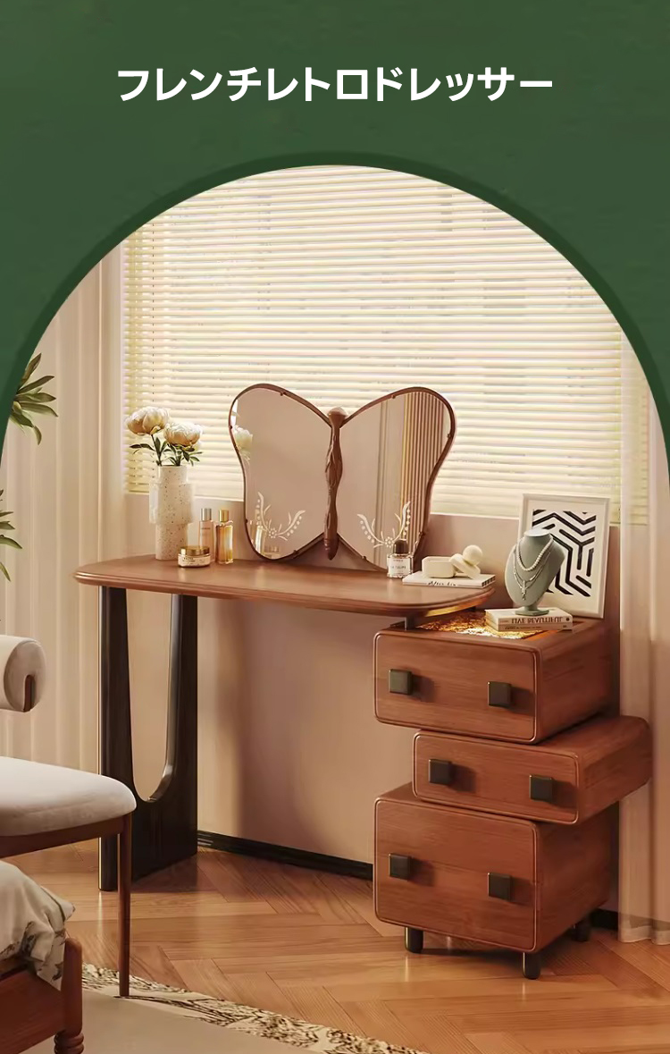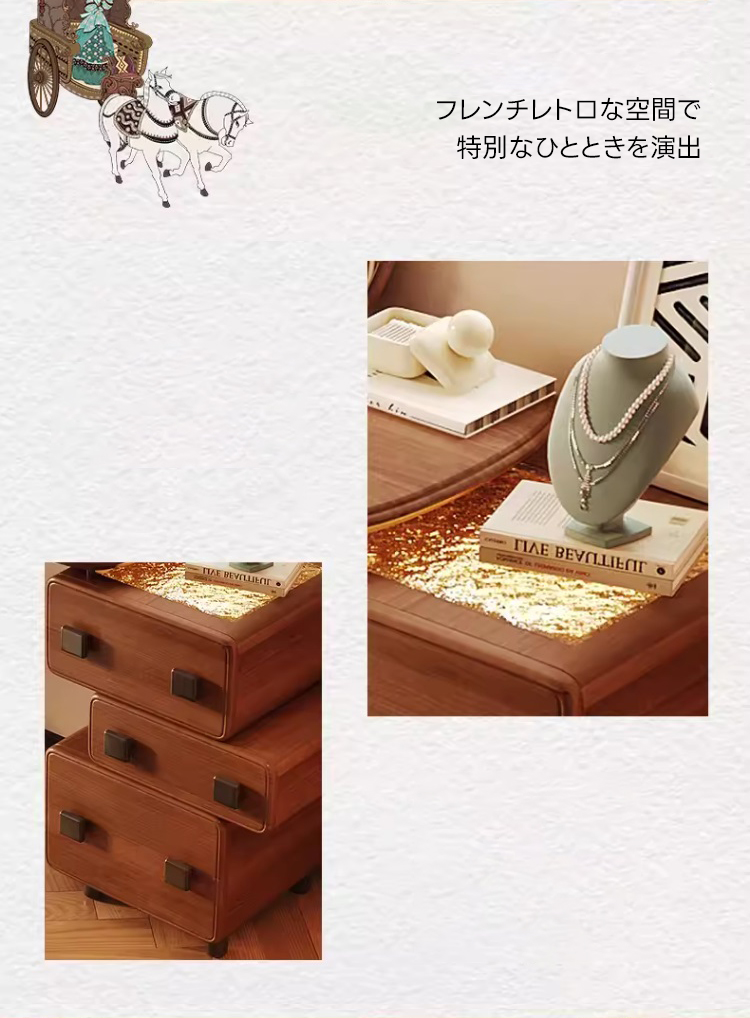 - 【ヴィンテージデザインで洗練された空間に】:フレンチレトロなデザインが特徴のこのドレッサーは、寝室やベッドルームにエレガントな雰囲気をもたらします。ヴィンテージ感漂うスタイルが、どんなインテリアにも調和し、上品な空間を演出します。