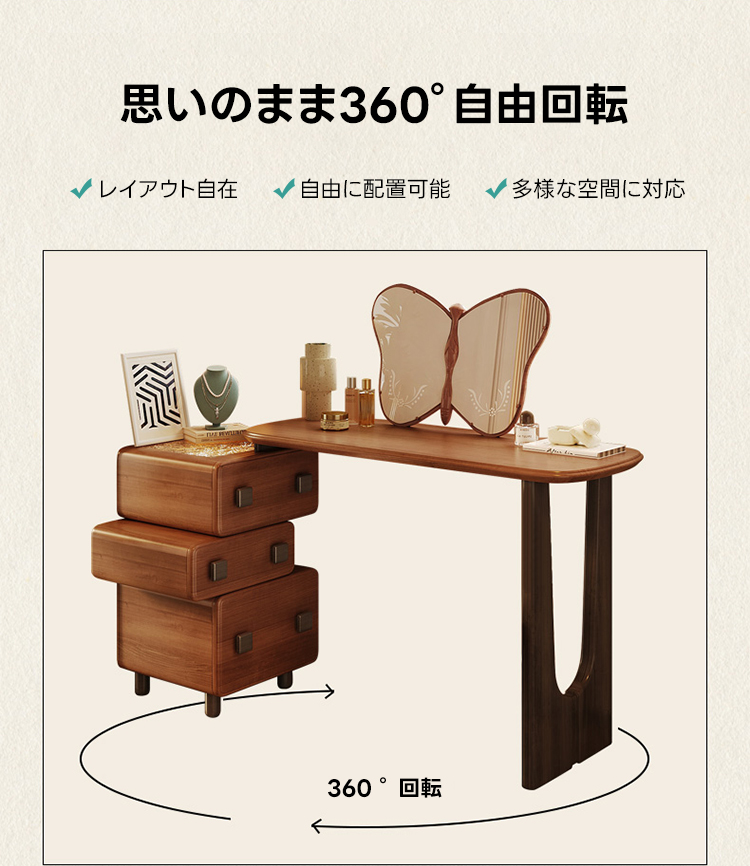 - 【自由な配置と簡単な組立】:組立品ながら簡単に設置可能で、左右どちらにも引き出しを配置できる自由度があります。360度回転可能なデザインで、様々な空間に対応し、使い勝手も抜群です。