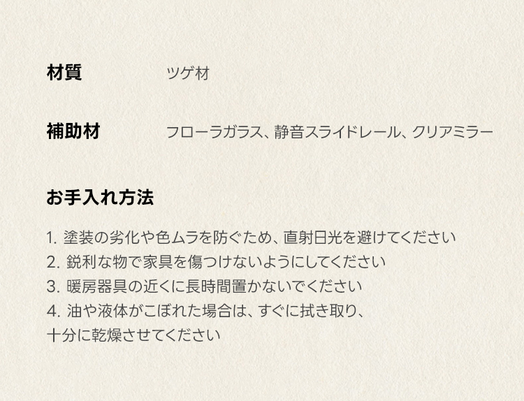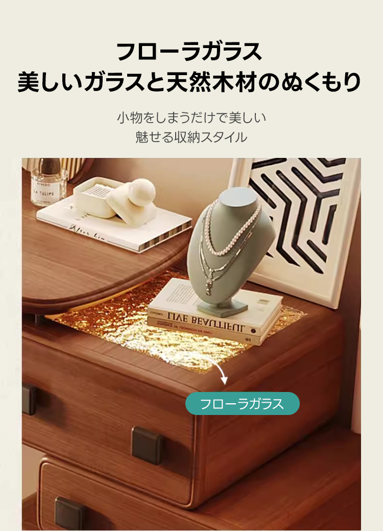 - 【高品質なツゲ材と優れた耐久性】:耐久性と耐荷重性に優れたツゲ材を使用し、長くご愛用いただけます。フローラガラスとクリアミラーが組み合わさり、エレガントな印象を与えます。