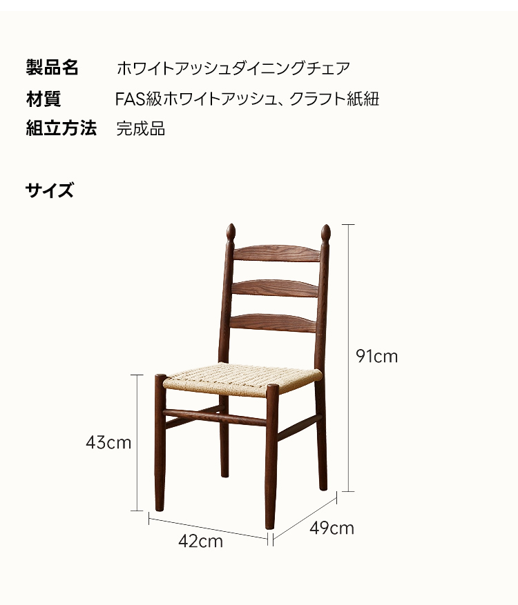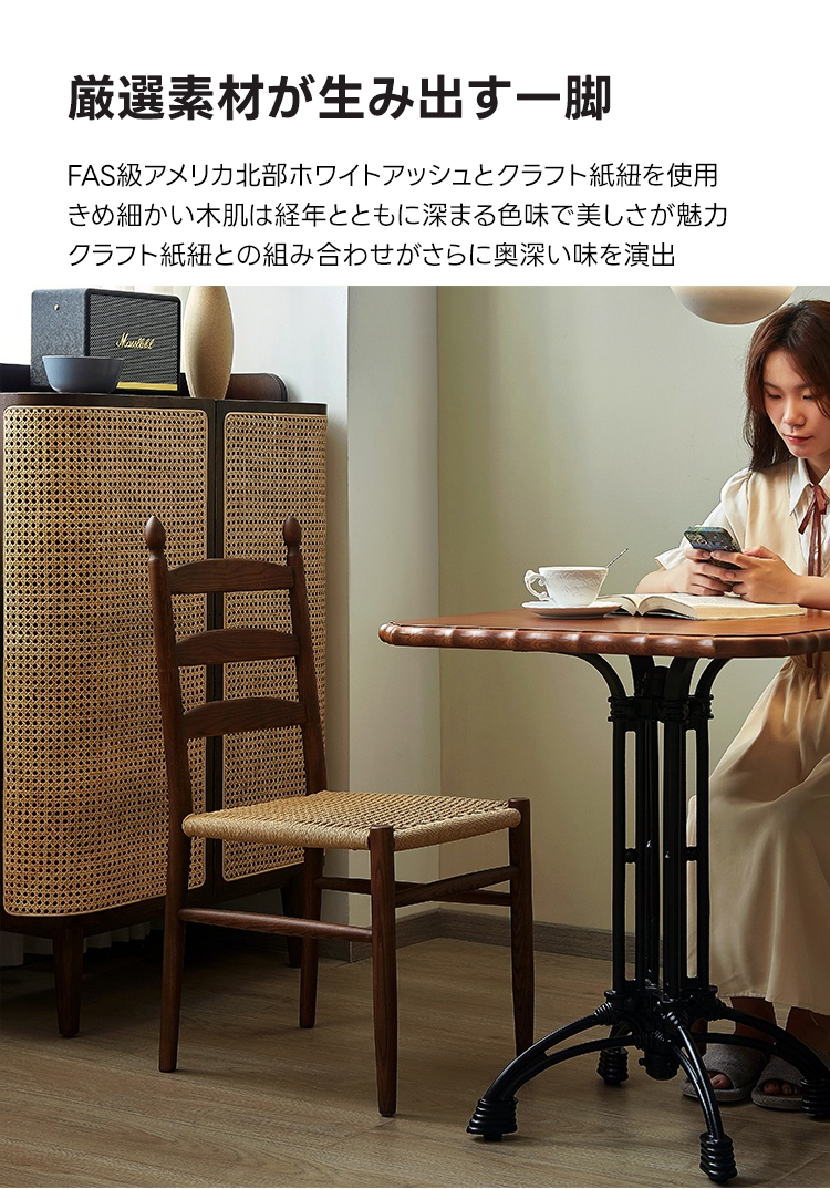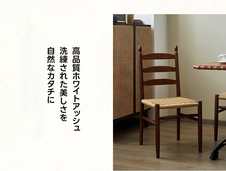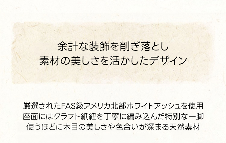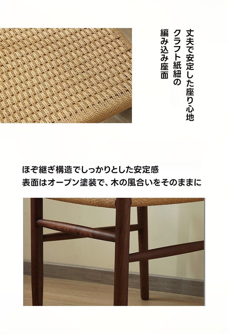 - 【高品質素材と快適な座り心地】厳選されたホワイトアッシュ材を使用し、耐久性に優れたダイニングチェアです。座面にはクラフト紙紐を丁寧に編み込んでおり、長時間座っても疲れにくい快適な座り心地を提供します。