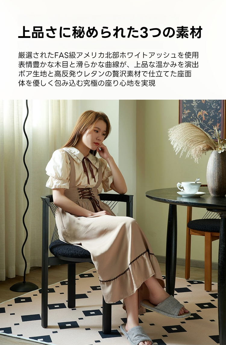 - 【ヴィンテージ感とモダンデザインの融合】:クロスコードラウンドチェアは、ヴィンテージの魅力とモダンなデザインを兼ね備えたダイニングチェアです。ホワイトアッシュ材とボア生地を使用し、視覚的にも触覚的にも優れた品質を提供します。