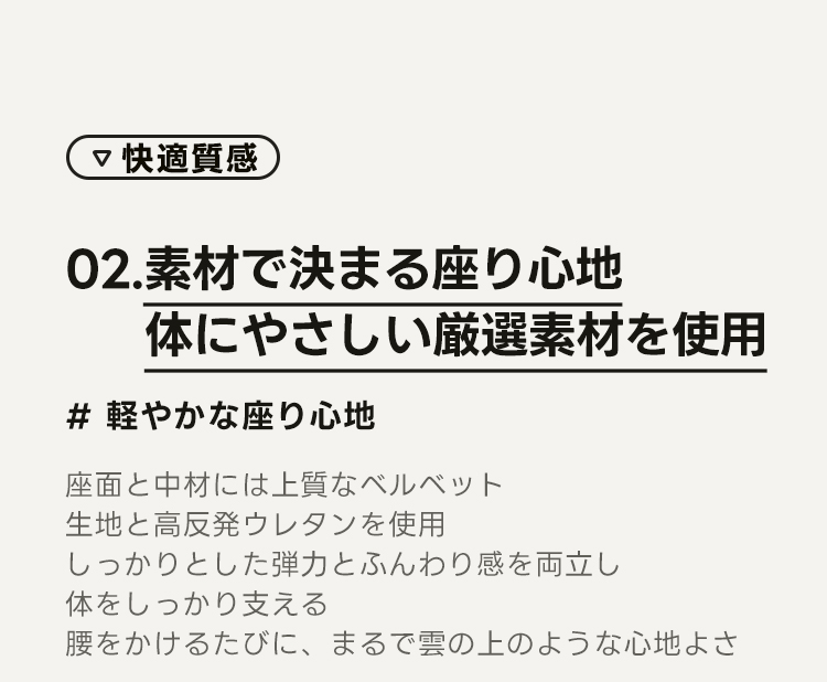 - 【快適な座り心地】高品質なベルベット生地と高反発ウレタンを使用し、しっかりとした弾力とふんわり感を両立。42cmの広々とした座面でゆったりと座ることができます。