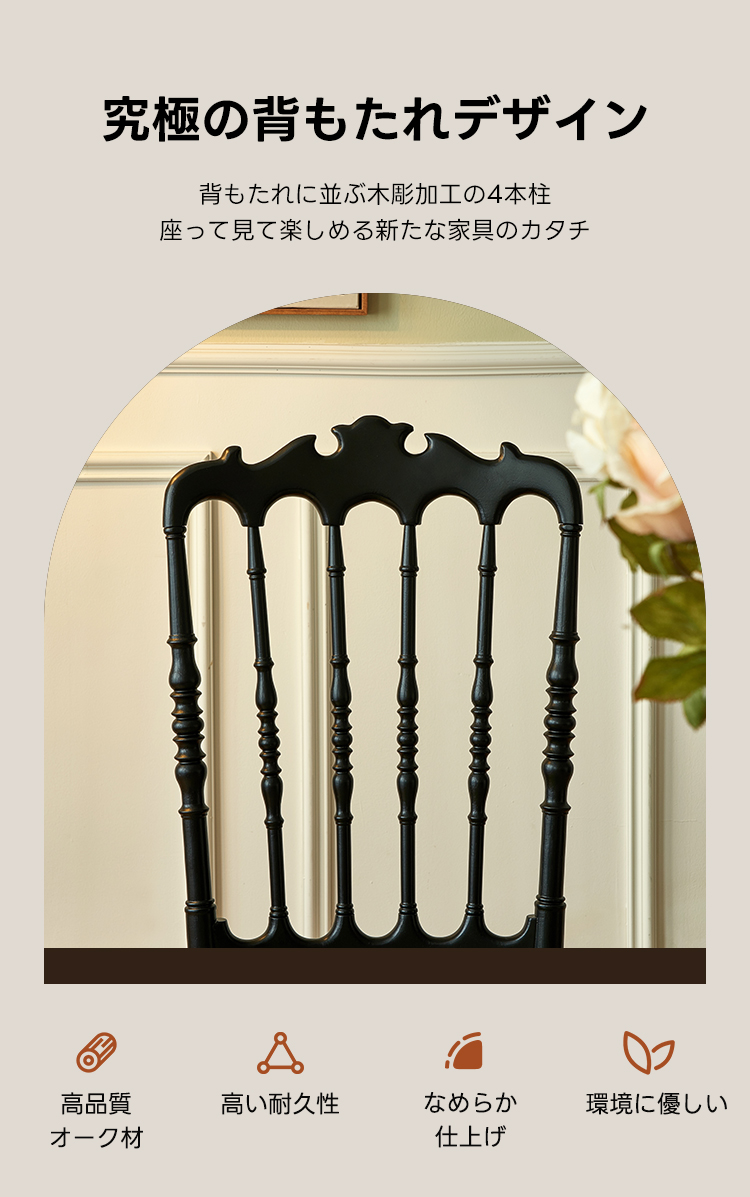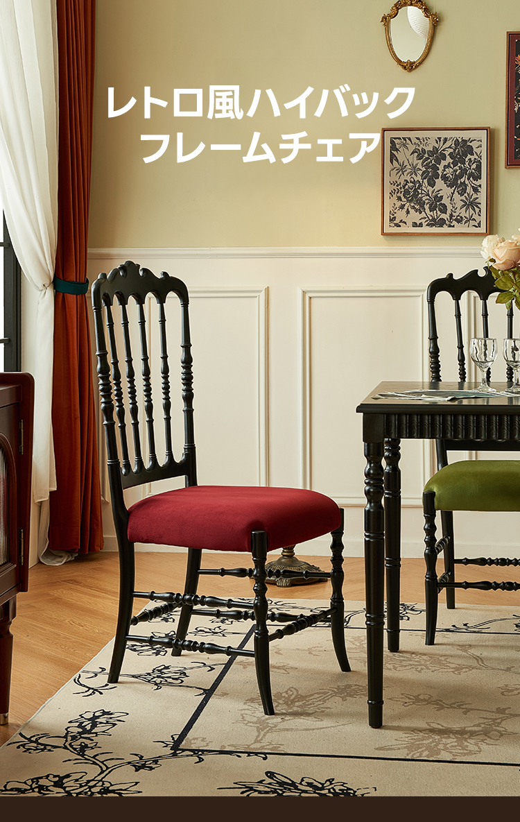 - 【ヴィンテージスタイルの魅力】:レトロ風ハイバックフレームチェアは、ヴィンテージスタイルを愛する方に最適な選択です。エレガントなデザインと高品質なレッドオーク材が特徴で、ダイニングルームに洗練された雰囲気を演出します。