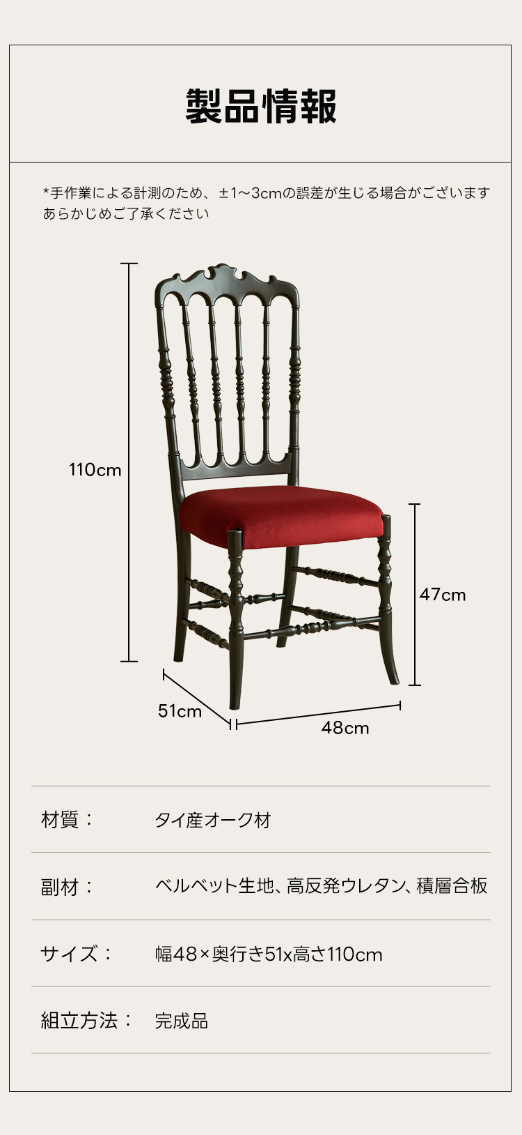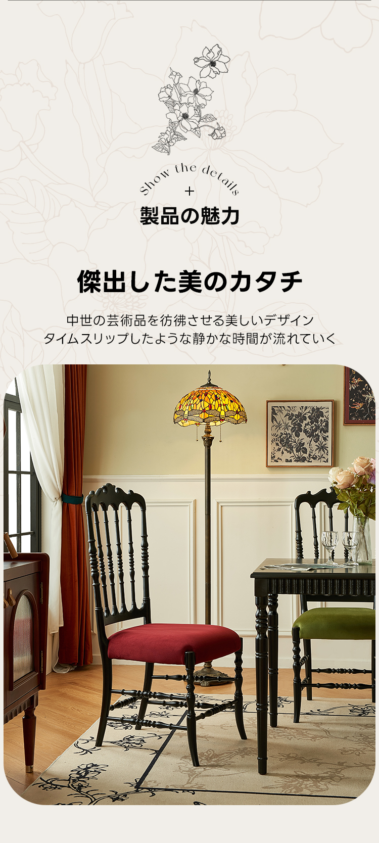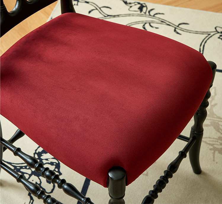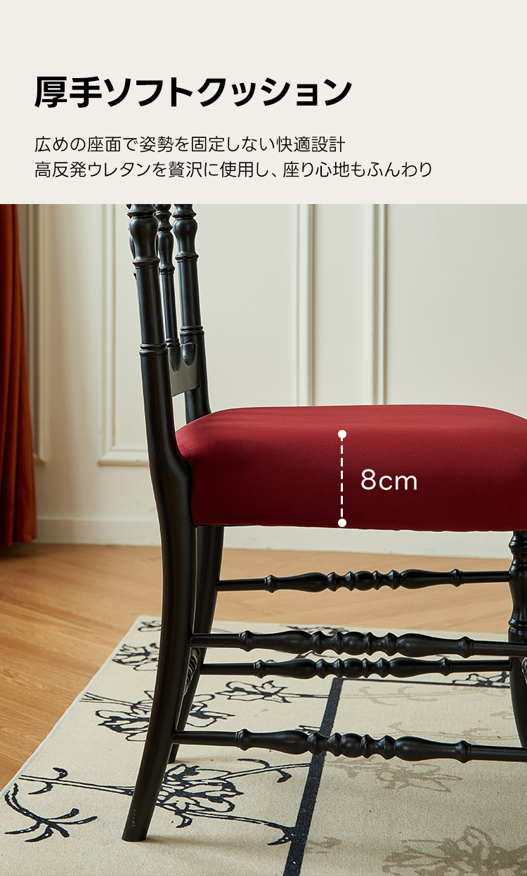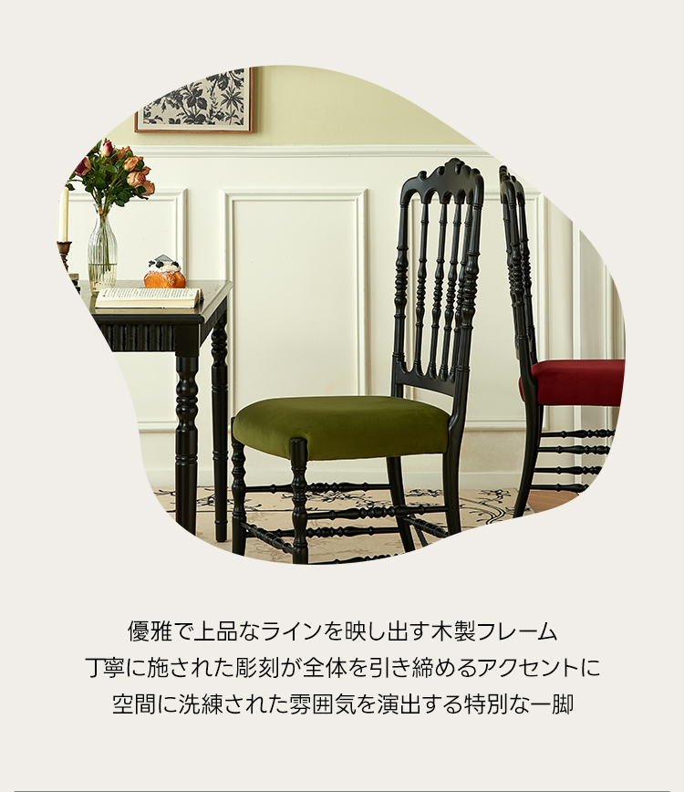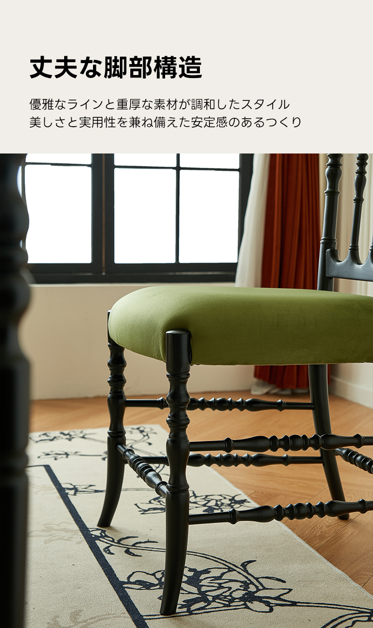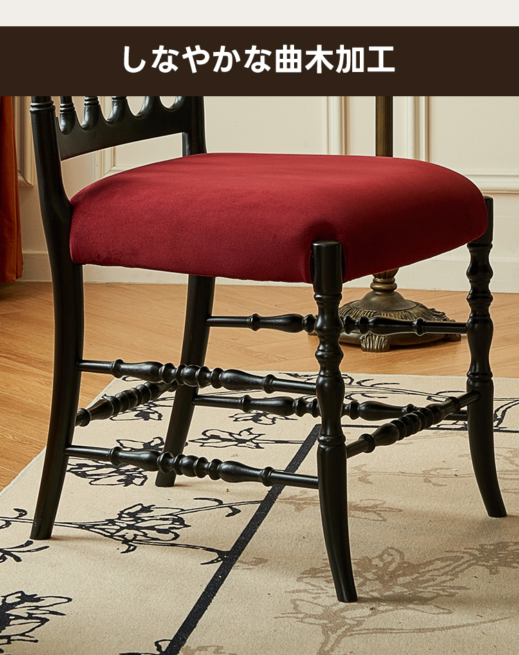 - 【高品質な素材とデザイン】:レッドオーク材とベルベット生地を使用し、自然な美しさと耐久性を兼ね備えています。丁寧に施された木製フレームの彫刻が、エレガントなラインを引き立てます。