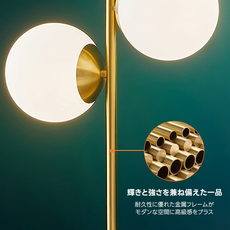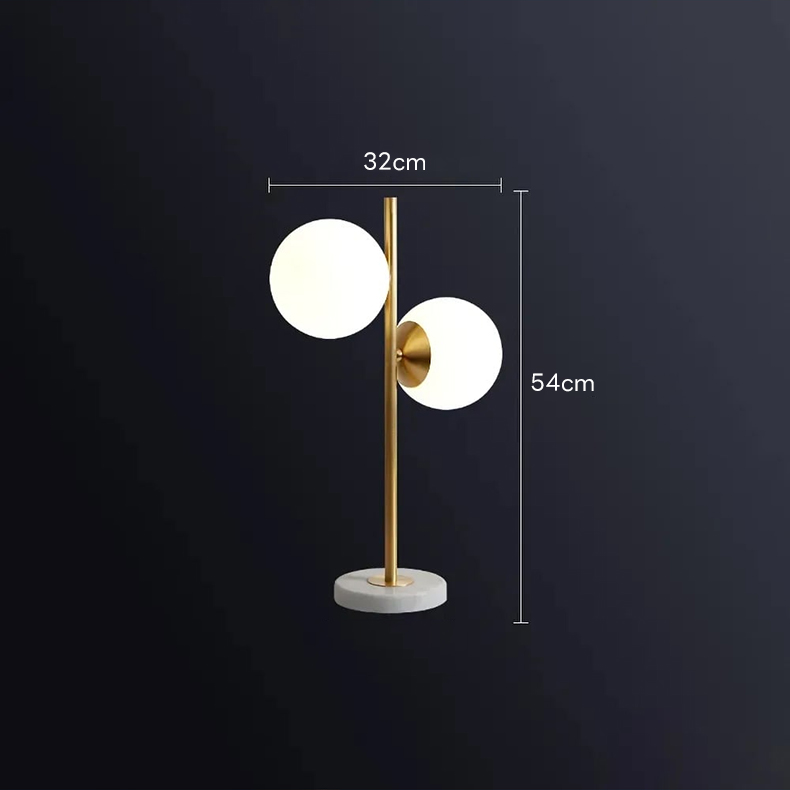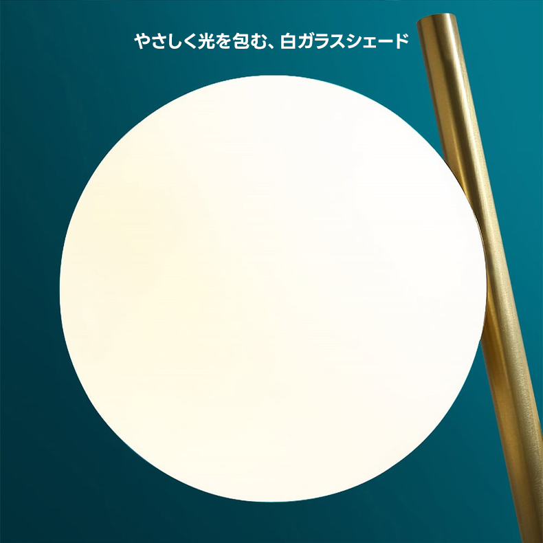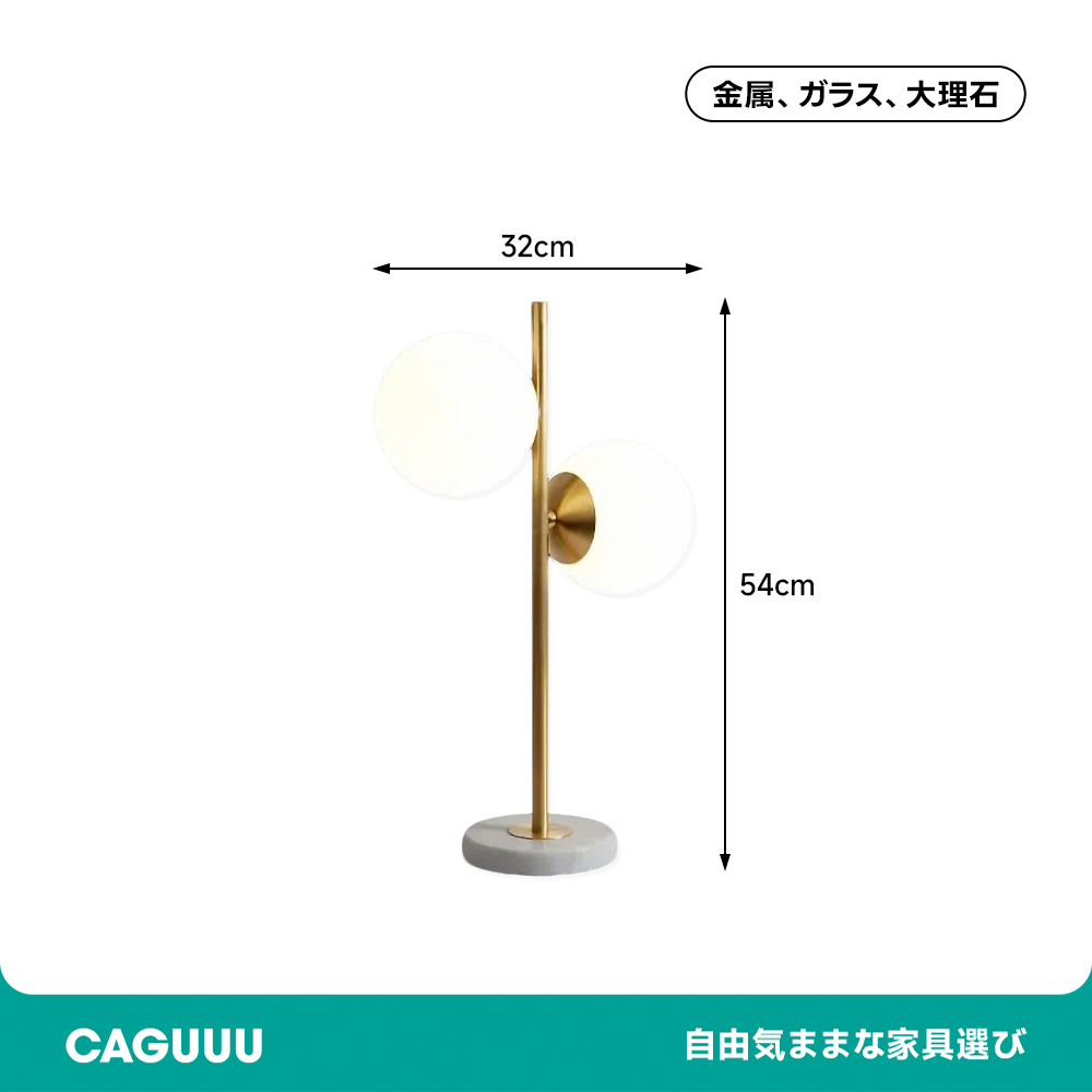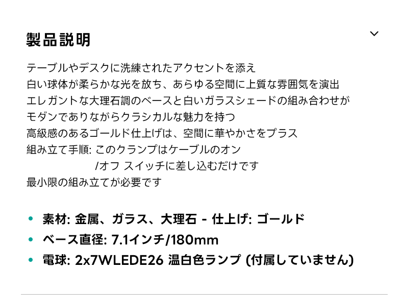 - 【高品質な素材と仕上げ】:金属、ガラス、大理石調の素材を使用し、ゴールドのポリッシュ仕上げが高級感を引き立てます。白い球体のガラスシェードが柔らかい光を放ち、ベースの直径は180mmで安定感があります。