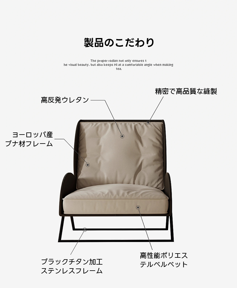 - 【高品質な素材と設計】ヨーロッパ産のブナ材フレームとブラックチタン加工のステンレスフレームを使用し、耐久性とデザイン性を両立。高反発ウレタンフォームのクッションが快適な座り心地を提供します。