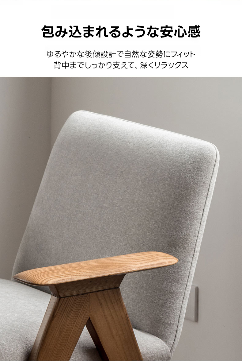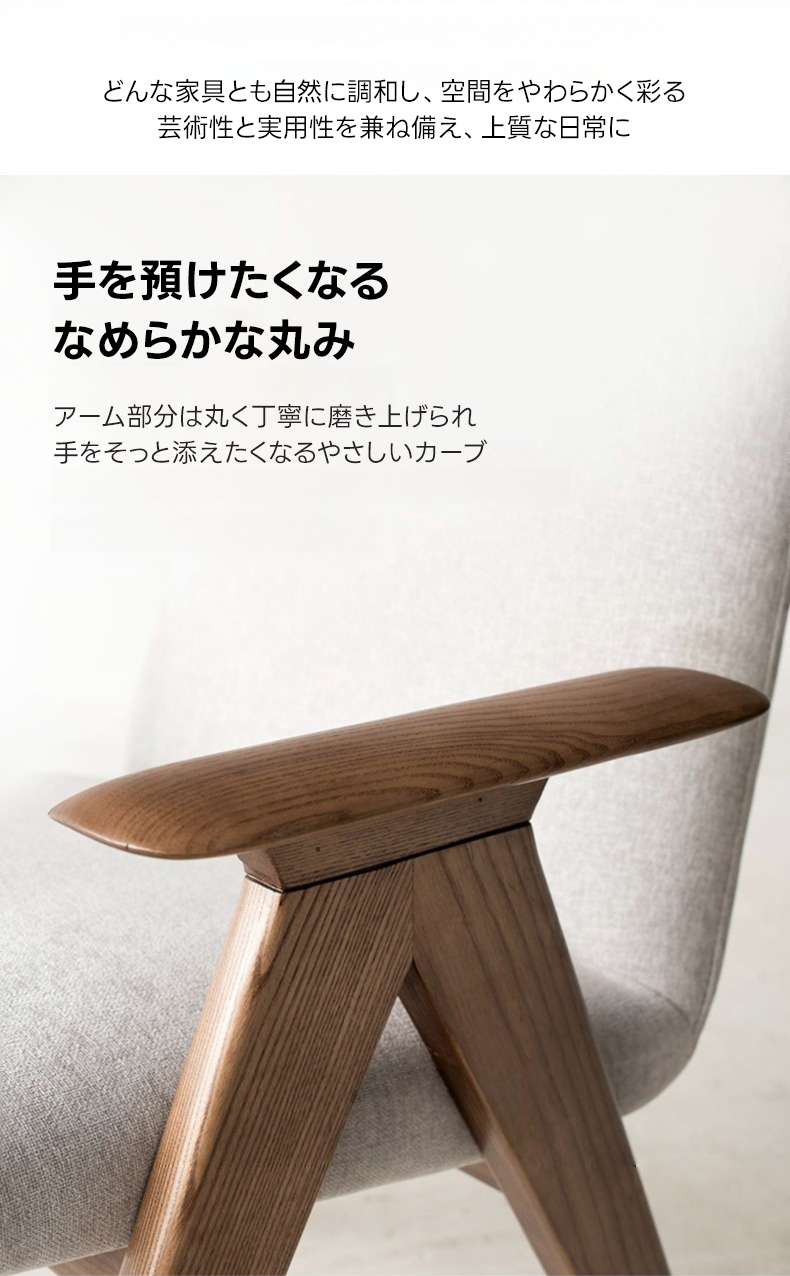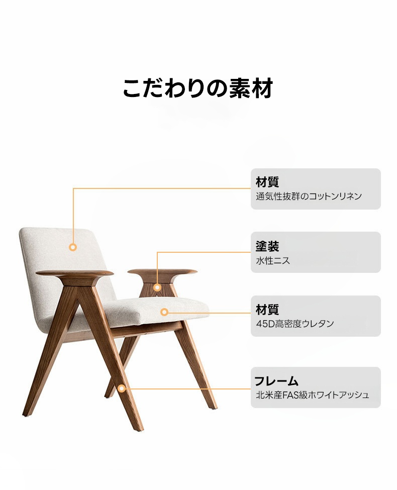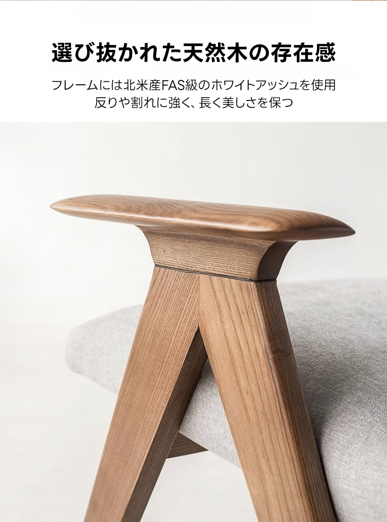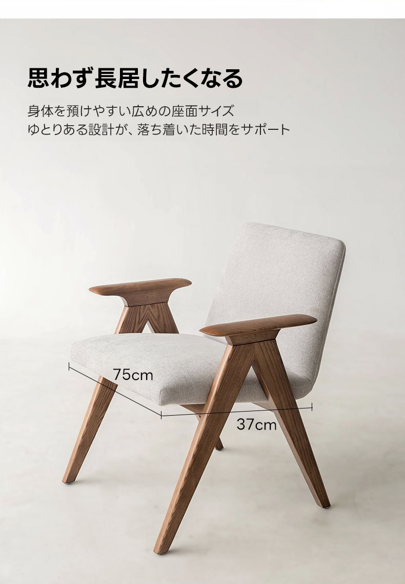 - 【高品質な素材とデザイン】フレームには耐久性に優れたホワイトアッシュ材を使用し、アーム部分は丁寧に磨き上げられた滑らかなカーブが特徴です。座面には通気性のあるコットンリネンと高密度ウレタンを使用し、快適な座り心地を提供します。