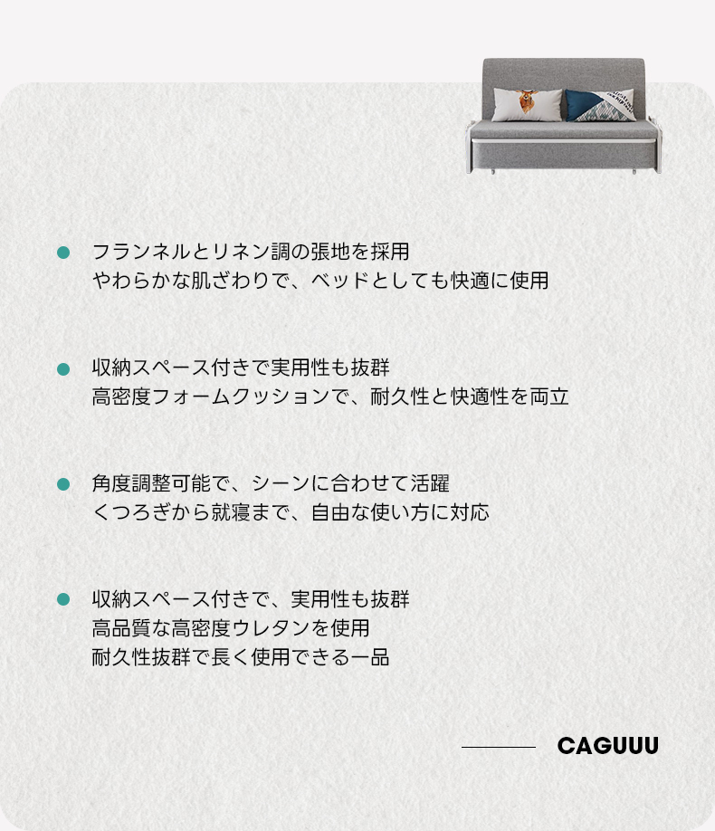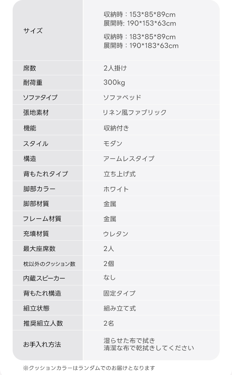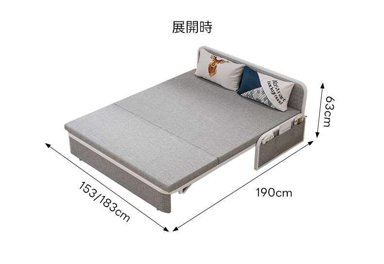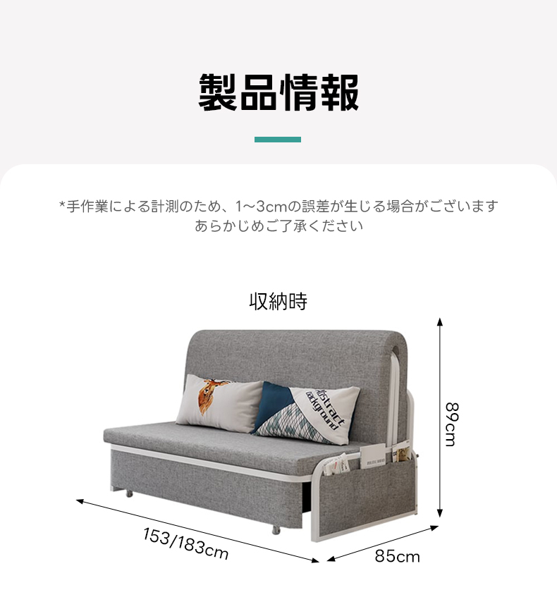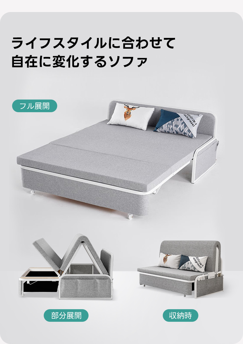 • 【多機能デザイン】:このリクライニングストレージソファベッドは、ソファとしてもベッドとしても使用可能で、スペースを有効活用できます。展開時のサイズは190×153×63cmで、収納時は153×85×89cmとコンパクトに収まります。