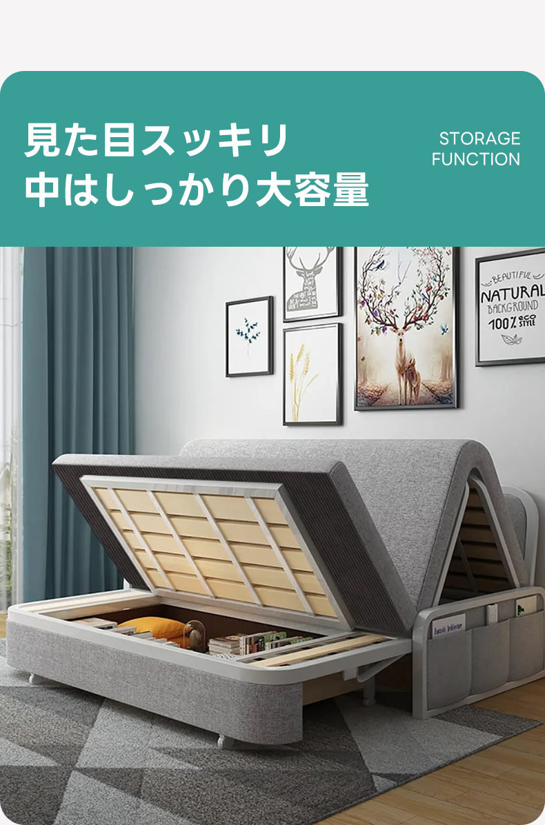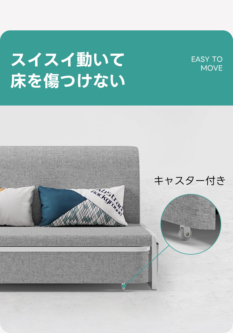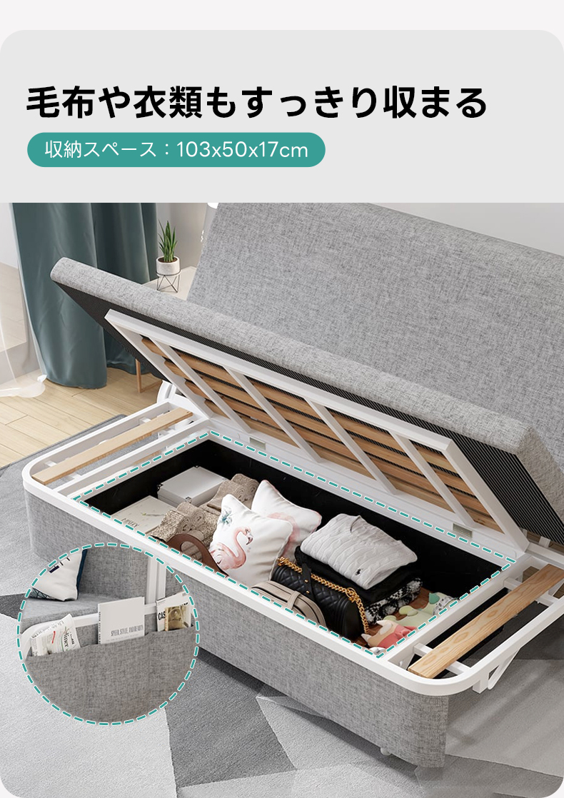 • 【快適な使用体験】:キャスター付きで、簡単に移動させることができ、床を傷つけません。ソファ下には大容量の収納スペース(103×50×17cm)があり、毛布や衣類などをすっきりと収納可能です。
