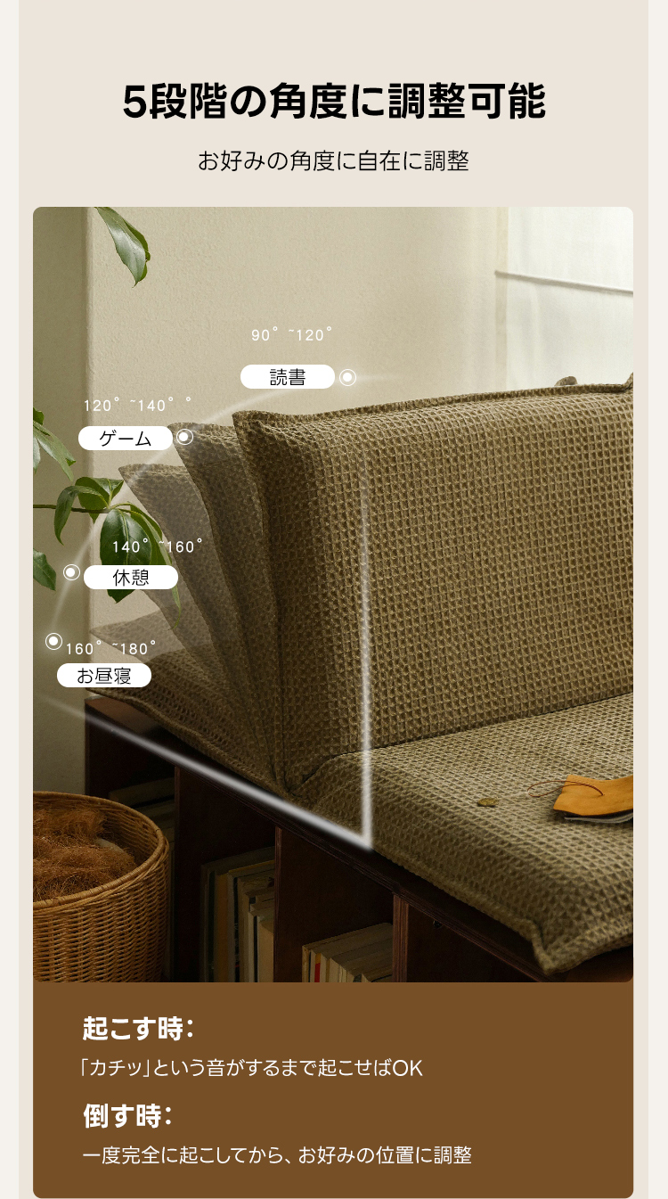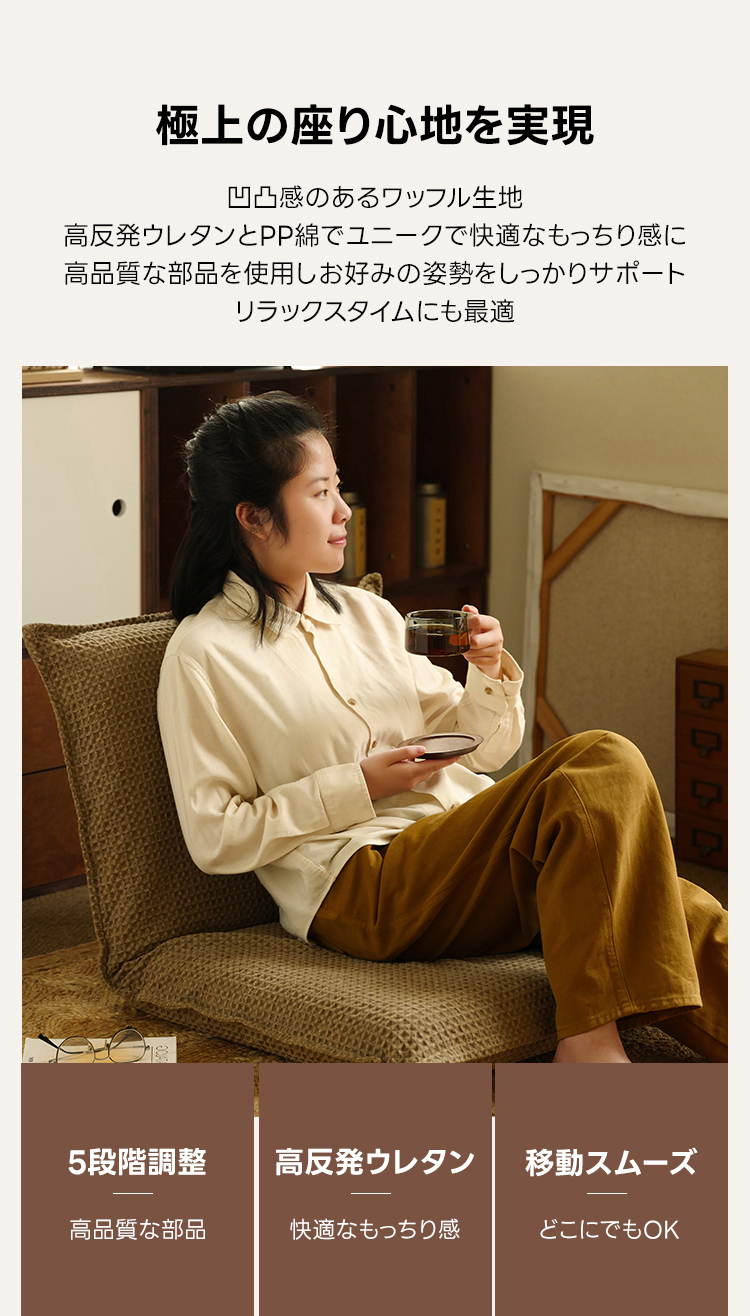 - 【快適な座り心地を実現】:高反発ウレタンとPP綿を使用したワッフルリラックスクッションは、長時間座っても快適さを維持し、へたりにくい設計です。5段階の角度調整が可能で、読書やリラックス、ゲーム、お昼寝など様々なシーンに対応します。