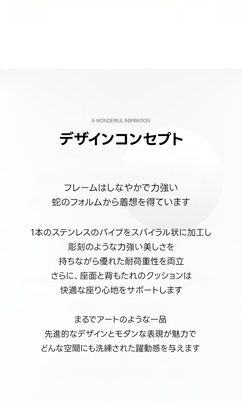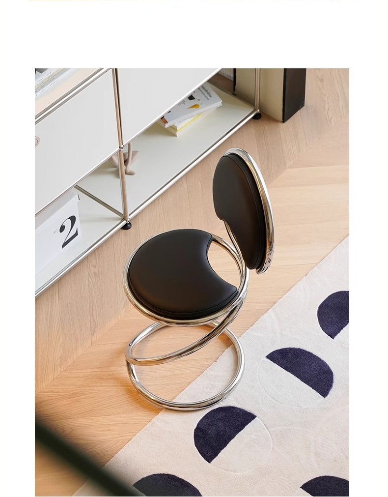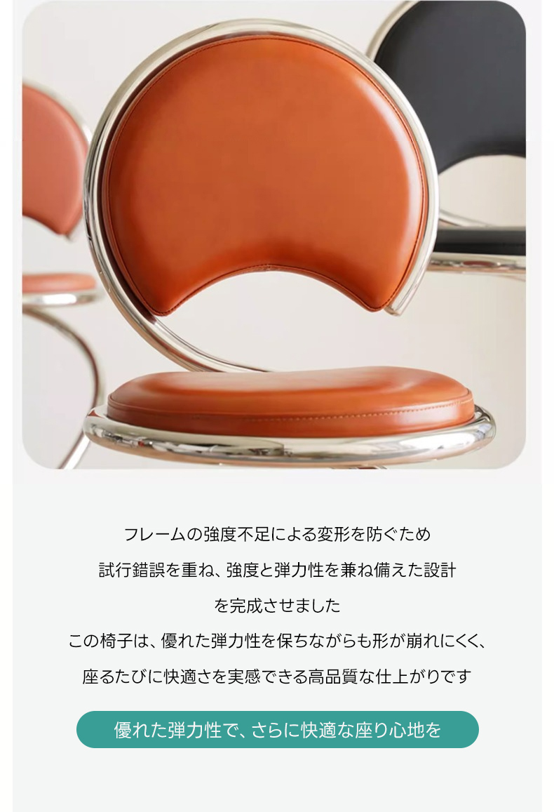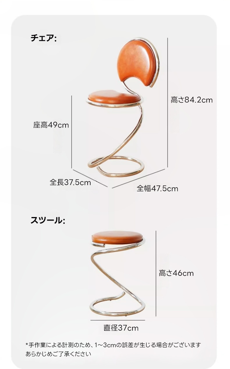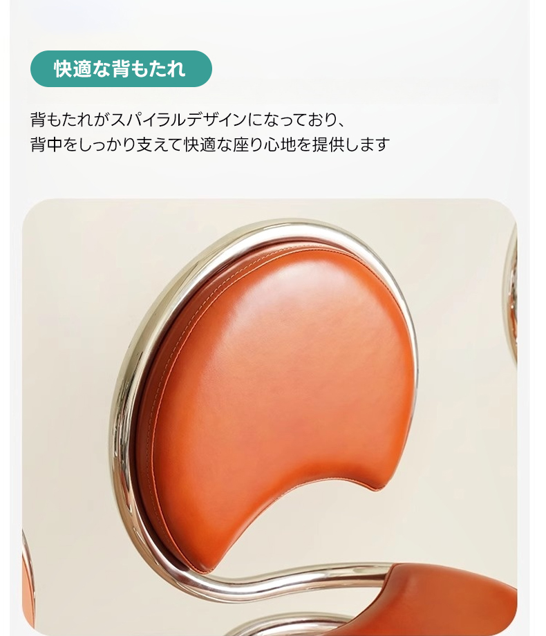 - 【革新的なスパイラルデザイン】このヌメ革スパイラルチェアは、シンプルでありながら洗練されたスパイラルデザインが特徴です。ステンレススパイプフレームを使用し、蛇のフォルムから着想を得た斬新なスタイルを実現。複数の脚を必要としないため、空間を広く使えます。