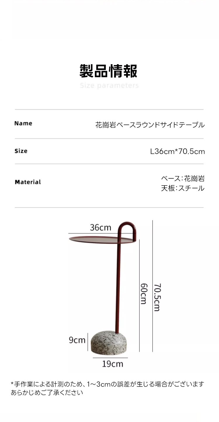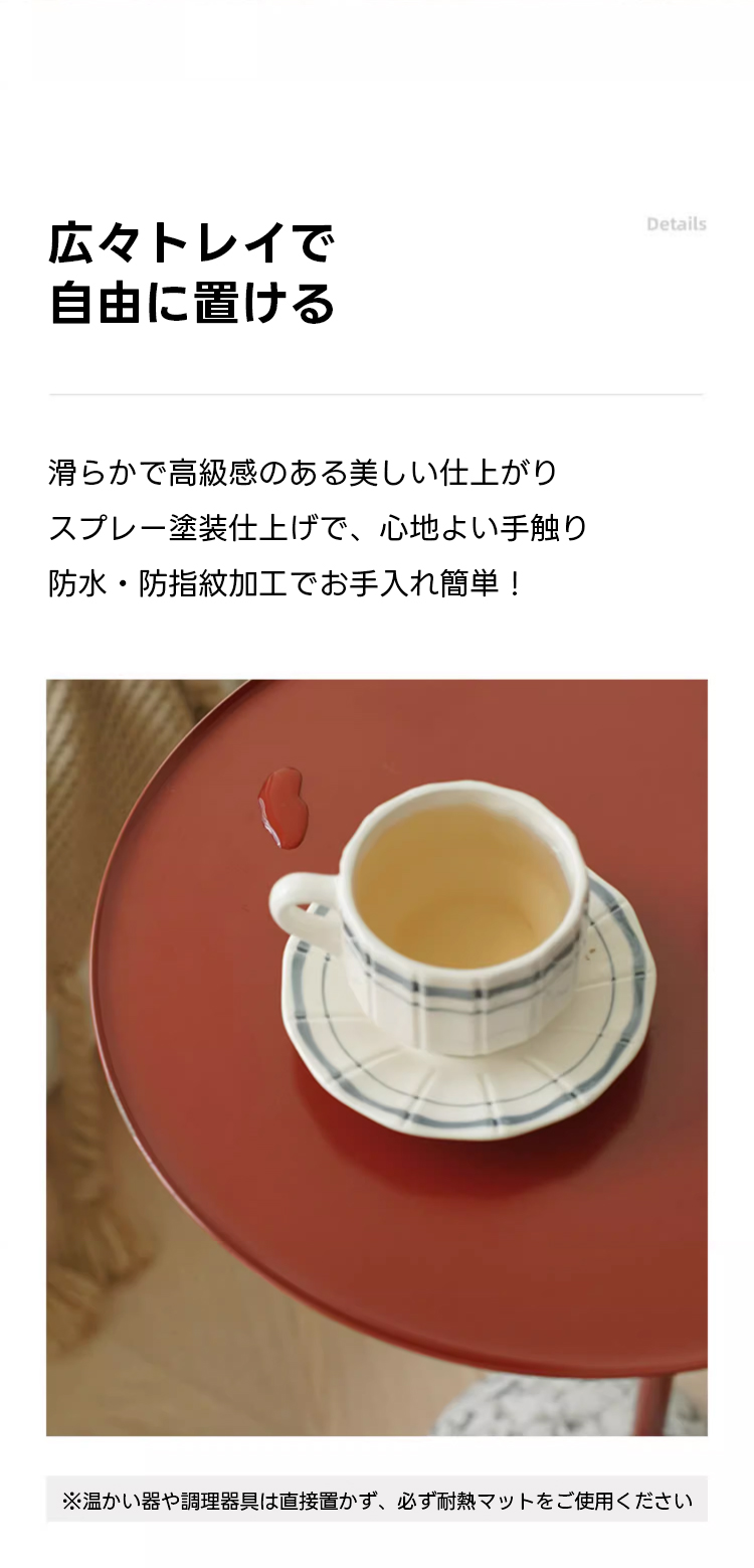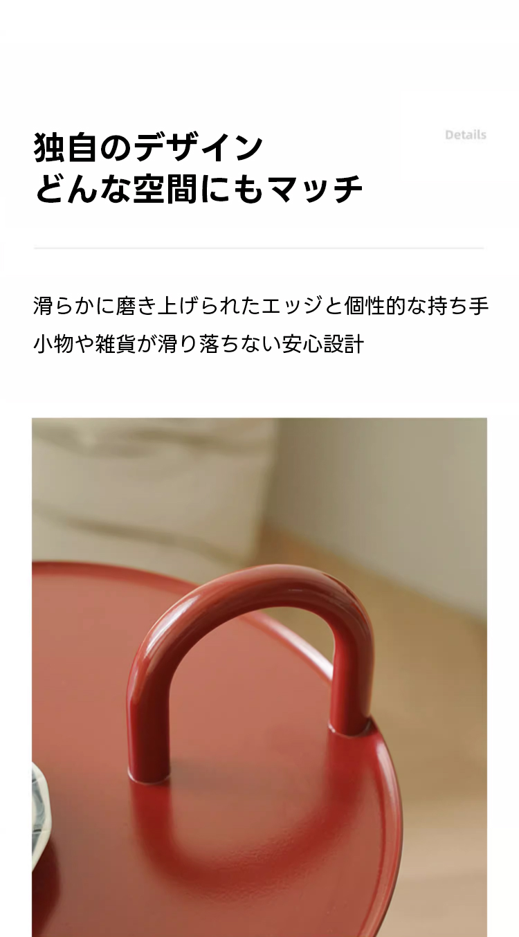 - 【洗練されたデザイン】エレガントでカラフルなデザインが特徴。円形の天板は直径36cm、高さ70.5cmで、持ち手が付いており移動が簡単です。防水・防指紋加工でお手入れも楽々。