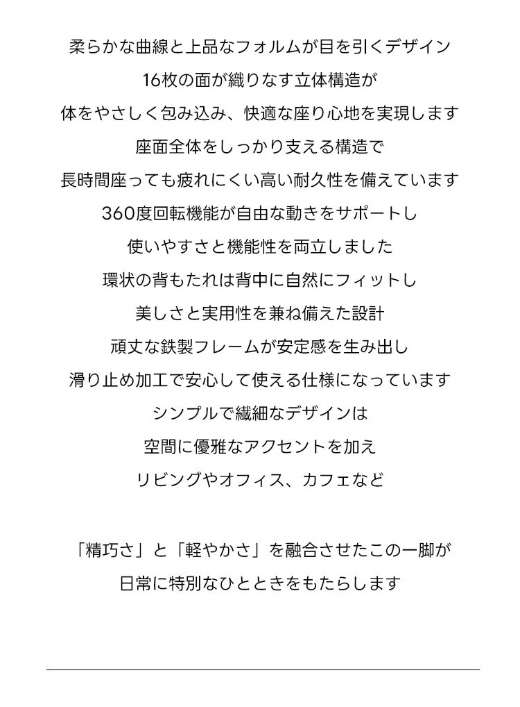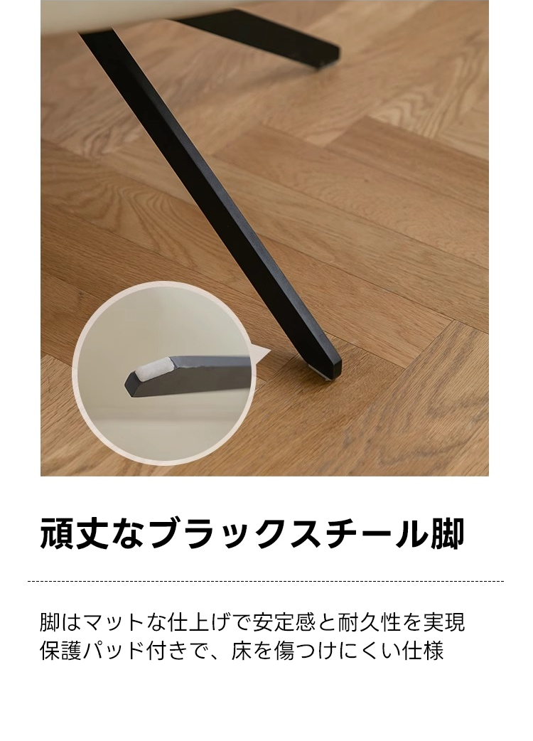 - 【安心の耐久性と保護設計】頑丈なブラックスチール脚は、マットな仕上げで安定感を提供。保護パッド付きで床を傷つけにくい仕様になっています。お手入れも簡単で、長持ちするため、長く愛用いただけます。