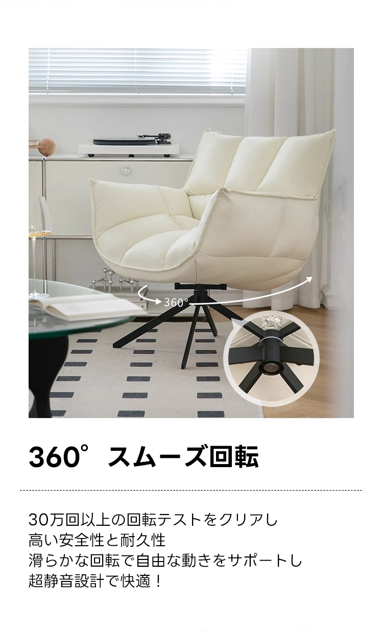 - 【360度回転機能で自由な動き】イタリアン回転式ソファチェアは、360度のスムーズな回転機能を備え、自由な動きをサポートします。30万回以上の回転テストをクリアし、高い安全性と耐久性を誇ります。オフィスやリビングでの使用に最適です。