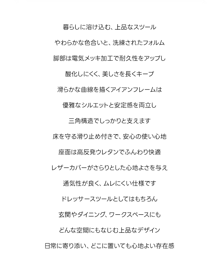 - 【多様な使用シーン】:このスツールは、ドレッサー、玄関、ダイニング、ワークスペースなど、さまざまなシーンで活躍します。コンパクトなサイズで、一人暮らしの方にもぴったりです。どんな空間にもなじむデザインで、日常に寄り添う存在感があります。