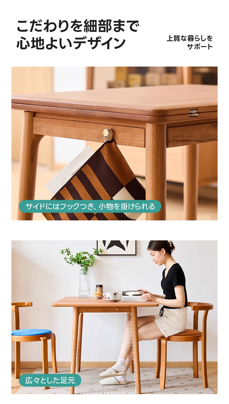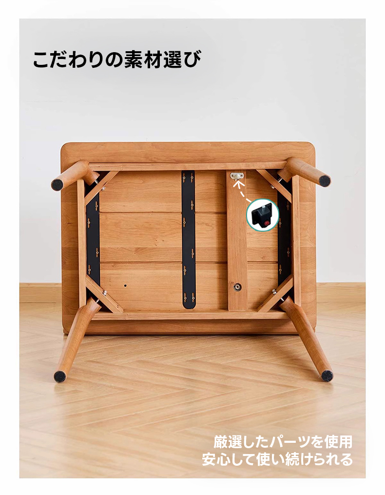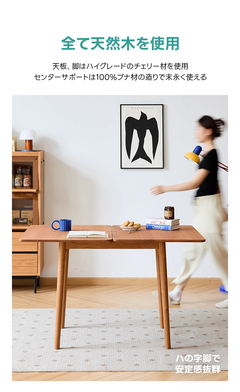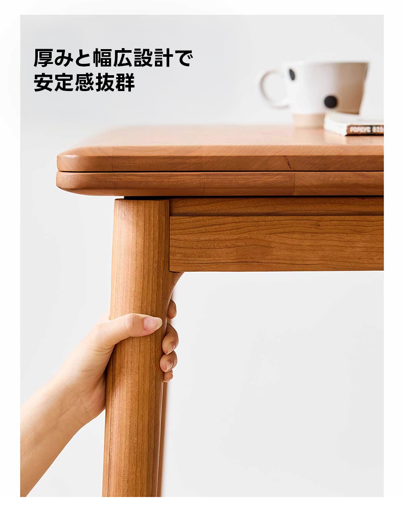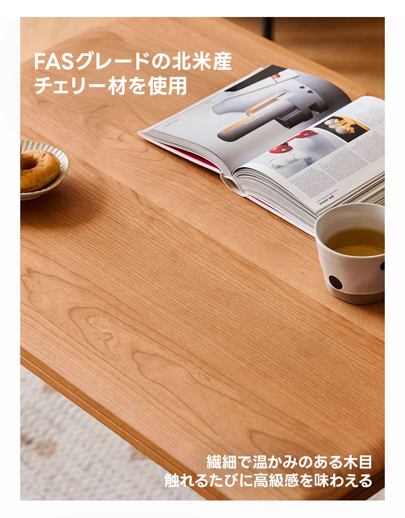 - 【高品質なチェリー材とブナ材を使用】FASグレードの北米産チェリー材を使用し、天板と脚部に採用しています。センターサポートには100%ブナ材を使用し、耐久性と安定感を確保。時間とともに色が深まるチェリー材の特性を楽しむことができます。