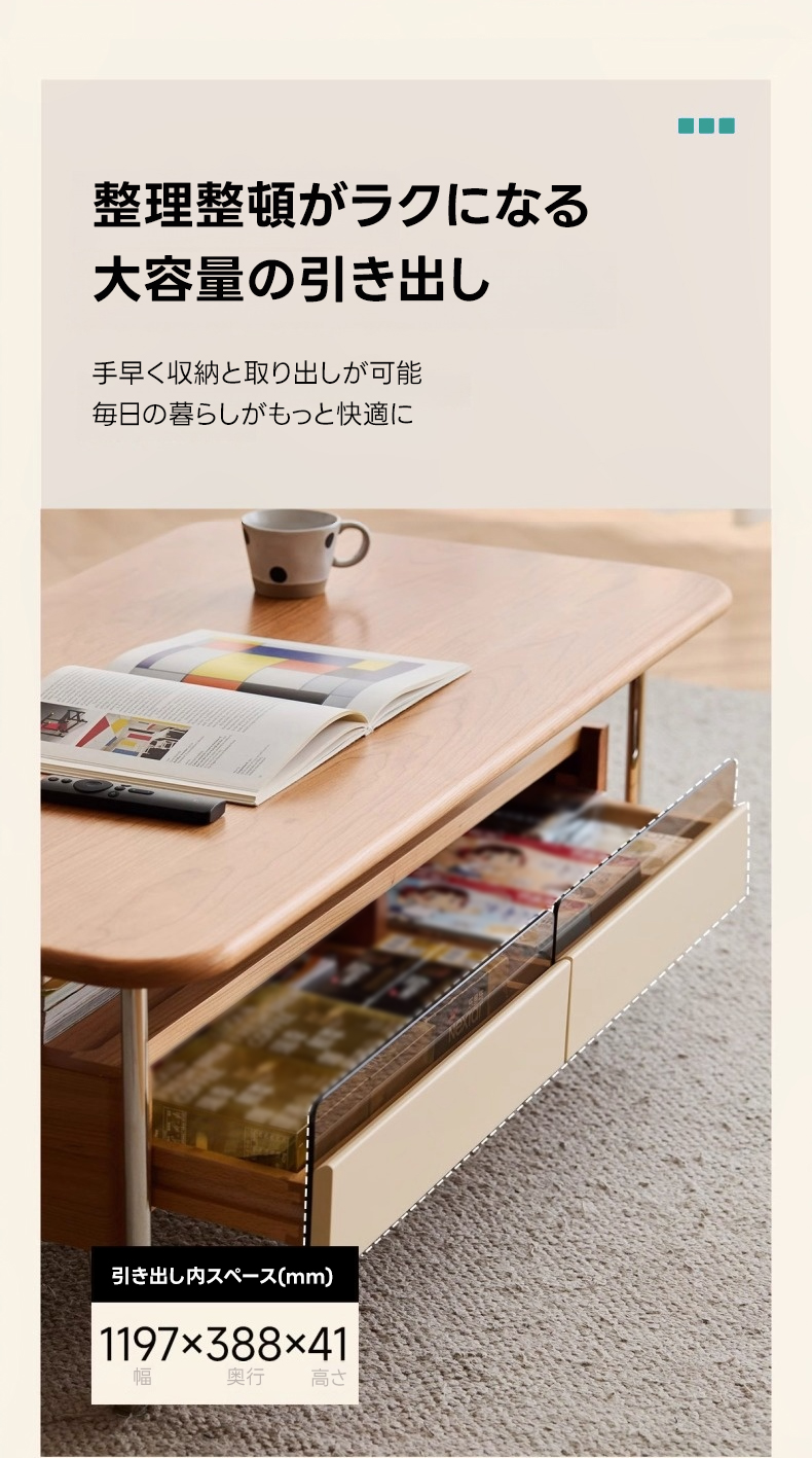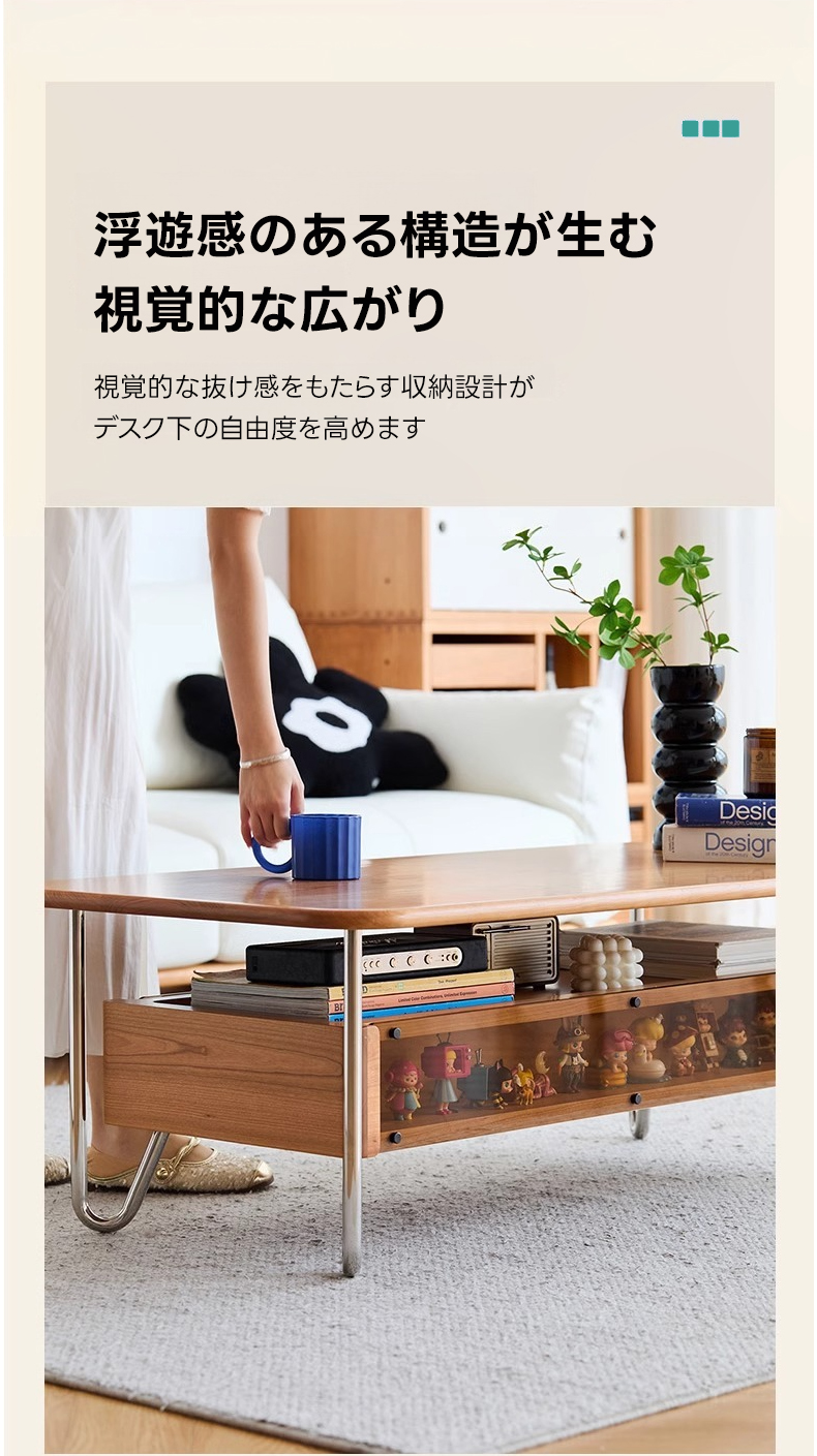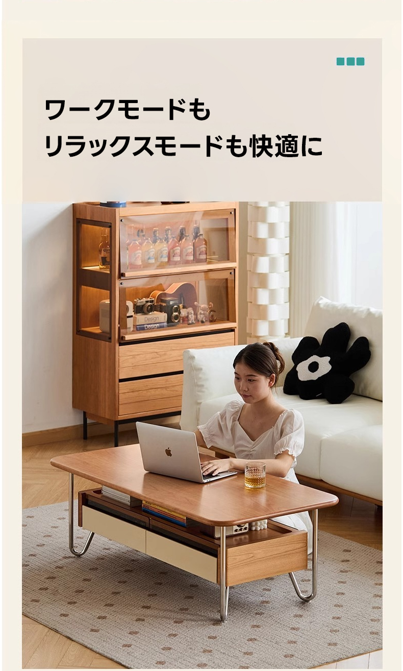 - 【多機能ガラス収納】このローテーブルは、ガラス展示スペースと2つの引き出しを備え、雑誌やリモコンをすっきりと整理できます。リビングルームをスタイリッシュに演出し、機能性も兼ね備えています。