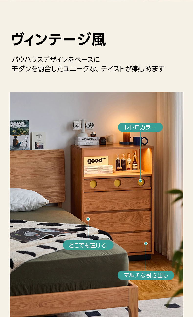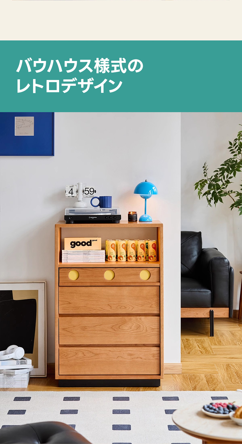 - 【ヴィンテージ風デザインと高機能収納】このキャビネットは、バウハウス様式をベースにしたレトロモダンなデザインが特徴です。リビングやベッドルーム、ダイニングなど、どんな空間にもマッチします。5段の引き出しで大容量の収納スペースを確保し、木製レールでスムーズに開閉可能です。