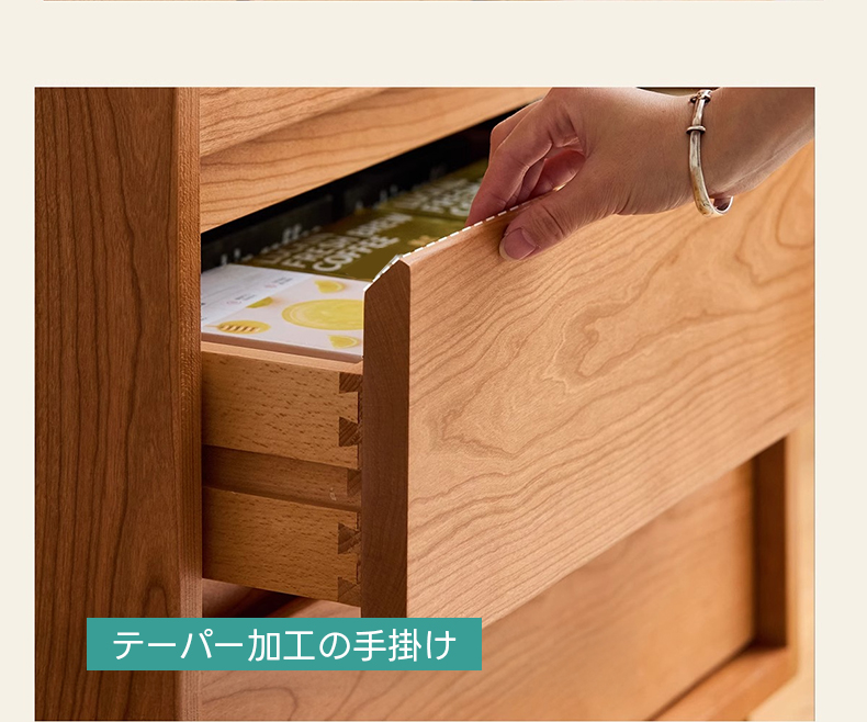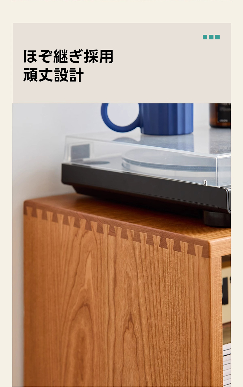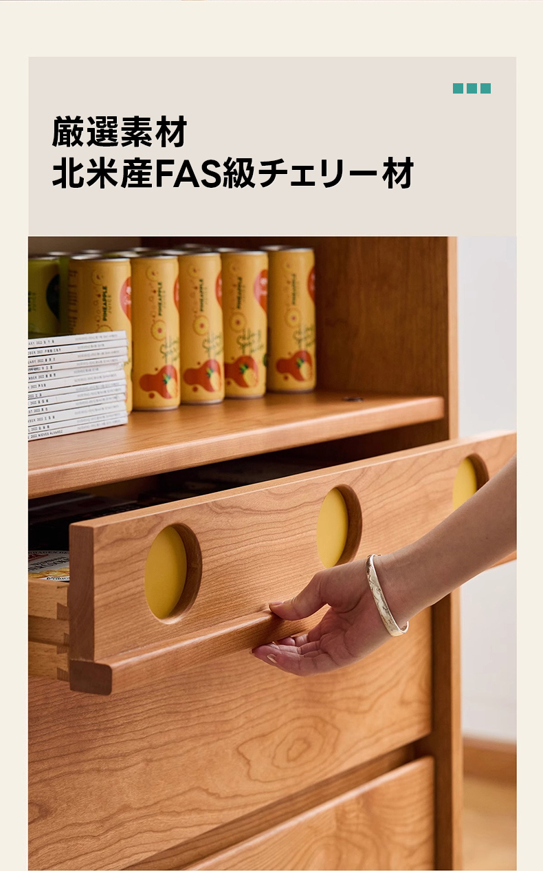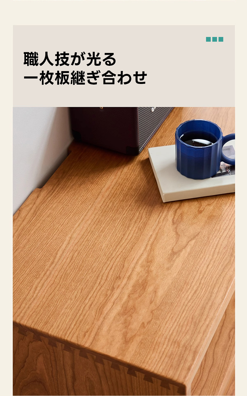 - 【高級チェリー材と細部へのこだわり】北米産FAS級チェリー材を使用し、自然な木目と色合いが時間とともに深みを増します。テーパー加工の手掛けや、ほぞ継ぎを採用した頑丈な設計で、床との隙間がないためホコリが溜まりにくい設計です。