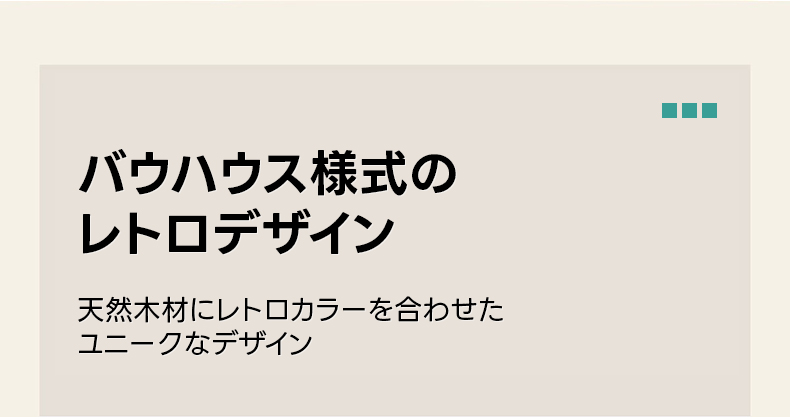 - 【ヴィンテージスタイルが魅力】バウハウスデザインを基にしたレトロなデザインが特徴で、モダンなインテリアに調和します。ナチュラルなベージュの色合いと木の温かみが特徴です。