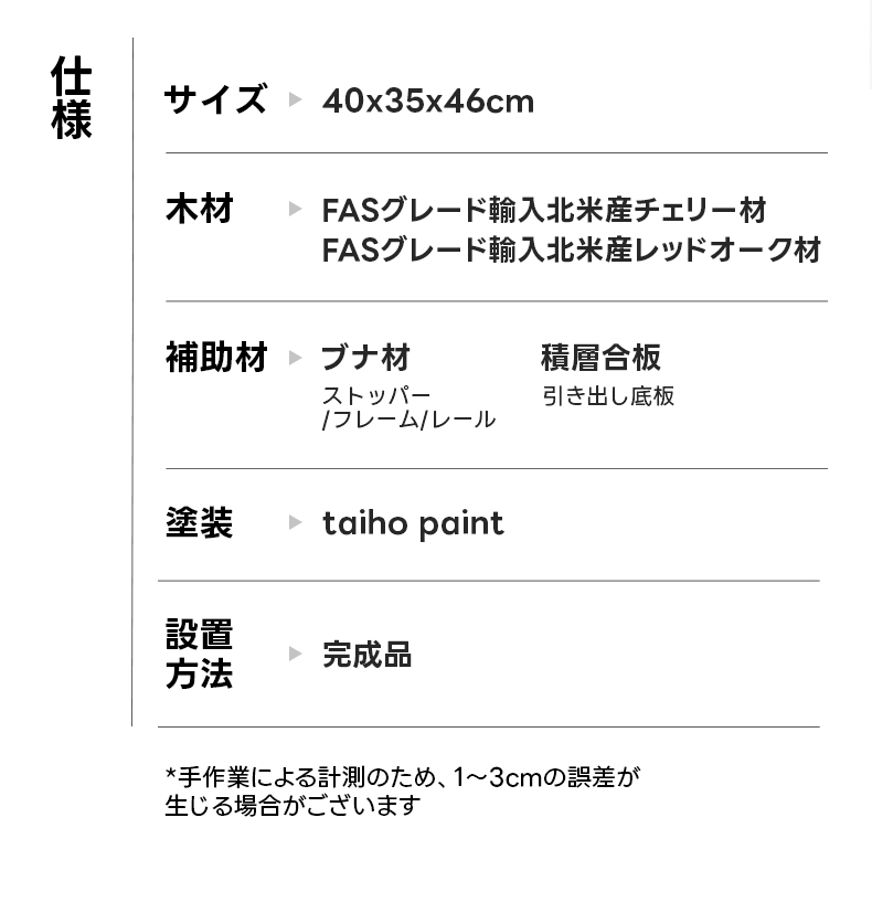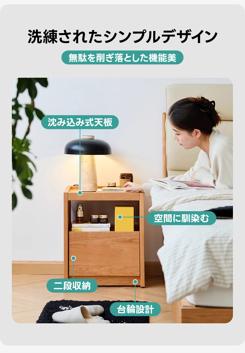 - 【高級感あふれるチェリー材使用】北米産FASグレードのチェリー材を使用し、美しい木目と深まる色合いが特徴。時間とともにその魅力を増すナイトテーブルです。