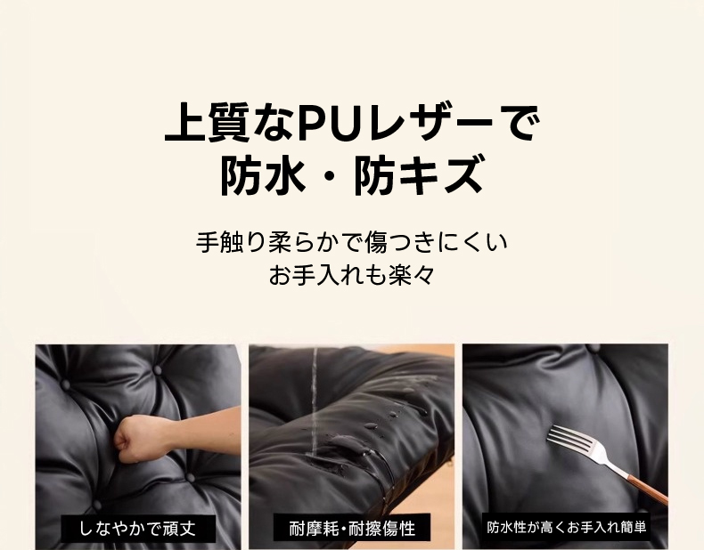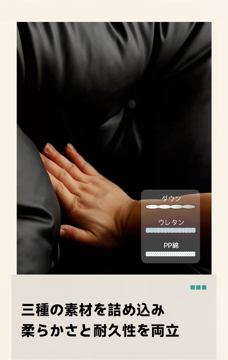 - 【高品質な素材としっかりした構造】:上質なPUレザーを使用し、防水・防キズ性能を備えています。クッションにはウレタン、PP綿、ダウンの三層構造を採用し、柔らかさと耐久性を両立しています。FAS級北米産チェリー材を使用したフレームは、しっかりとした作りで、ガタつきがなく安定感があります。